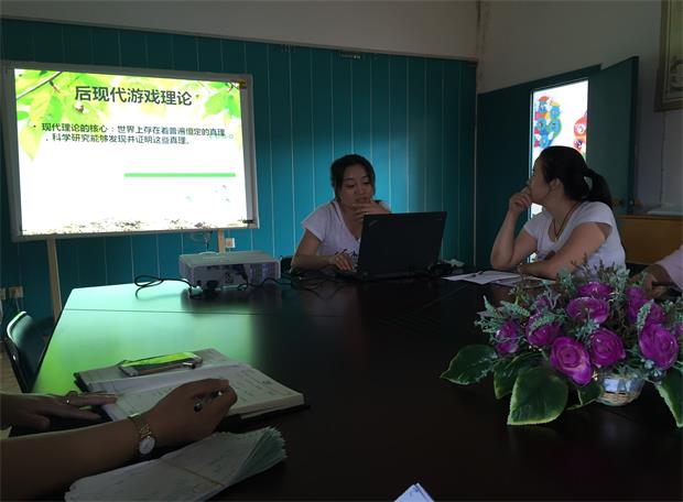 后现代游戏理论由胡一茹老师为老师们作介绍,相比较现代教育理论严谨的科学态度,后现代游戏理论更偏向研究者的价值观、信仰和世界观的影响。从社会文化的视角看游戏,对游戏中涉及到的某种文化价值保持敏感、恰当选择游戏材料和主题,注意游戏中的游戏行为和非游戏行为;批判游戏理论,给幼儿活动的选择权和控制权;混沌理论,减少教室的结构感,允许幼儿布置不同的玩具和工具,鼓励幼儿评价自己的行为。
