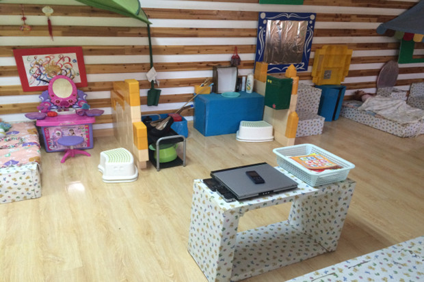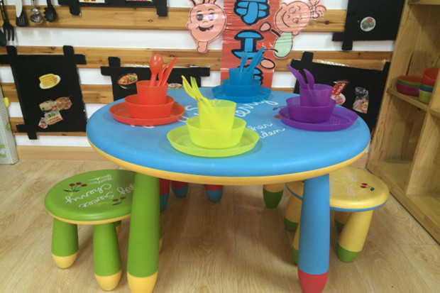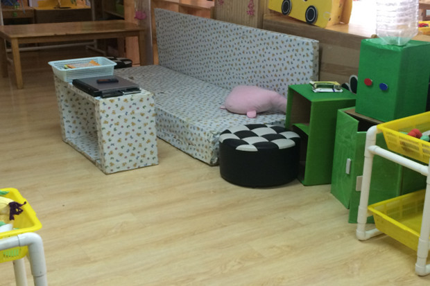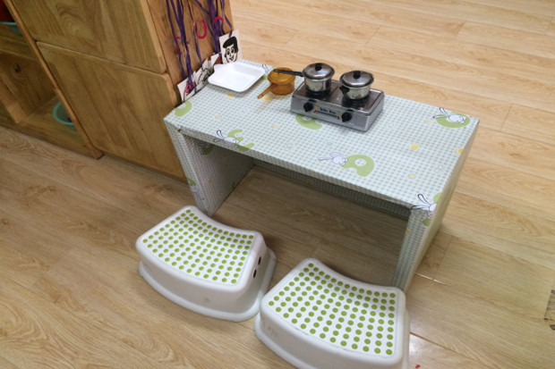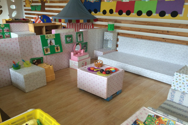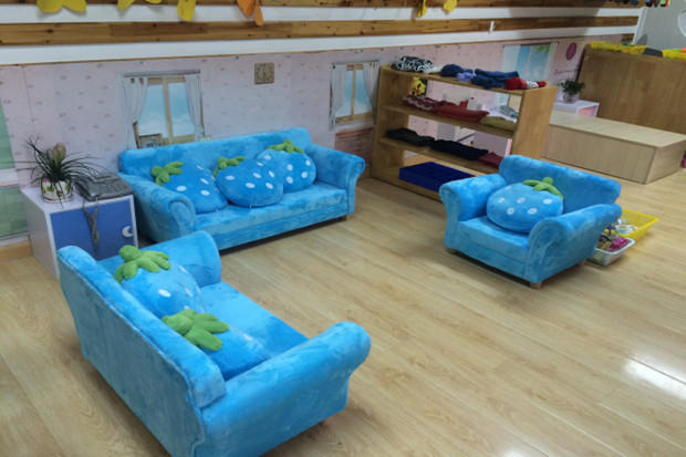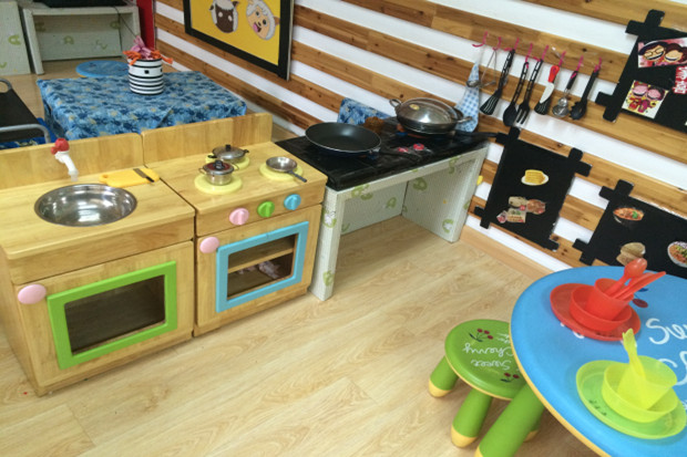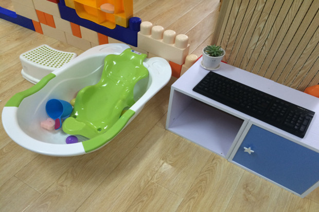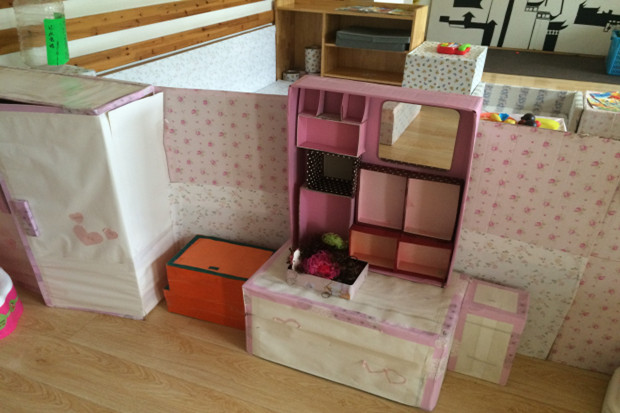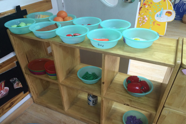 在幼儿入园之前,采菱园小班老师就对如何布置和利用娃娃家的空间环境,如何做好材料投放两方面展开讨论。最后确定“娃娃家”环境设置分别从温馨家庭氛围、工作环境、餐饮环境的营造和材料投放作为侧重点创设。为此,小一班新增了色彩亮丽的沙发、储物柜、浴盆和梳妆台,给幼儿营造了一种家的温馨;小二班为幼儿创设了生动的厨房环境,让幼儿体会到做饭的乐趣;小三班侧重点落在“娃娃家”客厅上,让幼儿自己做小主人学会接待客人;而小四班则是主打自己动手利用材料制作玩具来让幼儿玩耍。四个班都把整个教室的区域连成一个以“娃娃家”为主线的整体环境,让孩子充分的融入角色游戏情景中,自然、愉快的游戏。