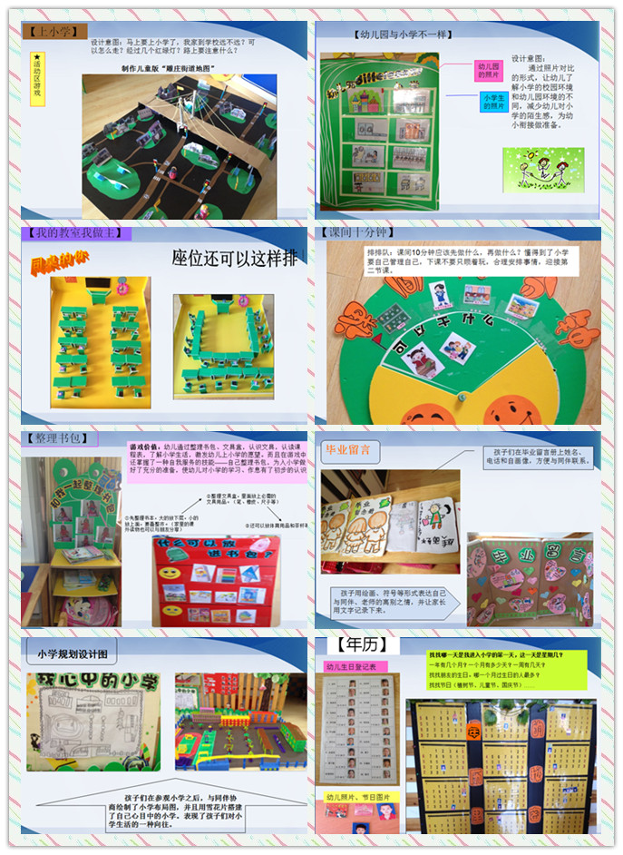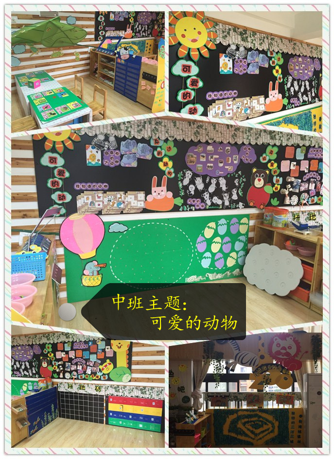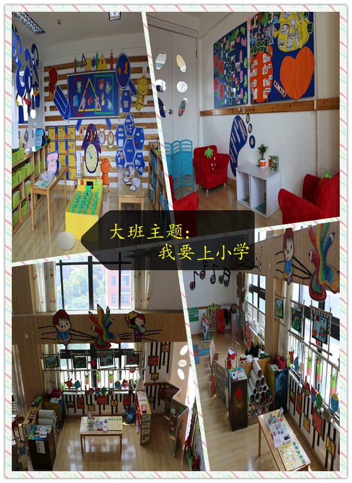 为此,各班教师根据《3—6岁儿童学习与发展指南》以及上海明师科技网各活动区的学习,针对不同年龄段的幼儿、不同的主题、不同的发展目标对区域活动精心设计,关注层次性、有效利用现有空间,尽量提供低结构探索性游戏材料(有隐藏目标)或者非结构表现性游戏材料(无预设目标),让孩子们在各个区域中自主选择、相互合作,在开放、自由的环境中充分体验自主学习的快乐。比如中班主题活动《可爱的动物》,我们分别创设了《猜猜小动物》、《量量离家有多远》、《动物之家》、《打扮小动物》、《动物套圈》、《找尾巴》、《找影子》、《动物快递员》等一系列主题性区域活动,让幼儿在开放的区域游戏中了解常见动物的名称、特征和习性,愿意通过绘画、对比等方式表现动物的特征。又如大班主题活动《我要上小学》,我们创设了以幼儿为本,童真童趣的《毕业倒计时》《美丽的小学》《毕业留言墙》《课间10分钟》等区域环境;逐渐生成了以生活美为主题的《整理小书包》《学系红领巾》《我心中的小学》《快乐小舞台》《最萌毕业照》等班级环境,整个主题创造出生态的、自然的、和谐的、生长的教室环境。