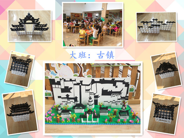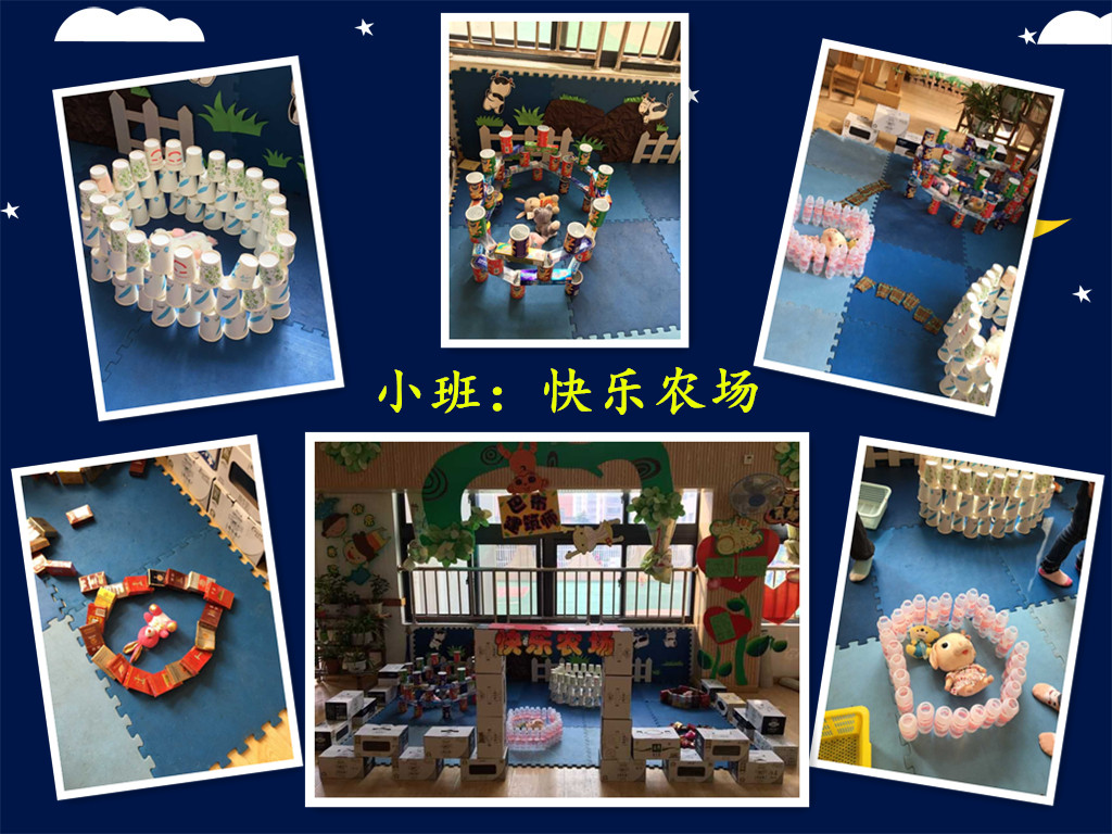 近日各班正以相应的主题进行建构游戏活动,小班在《我喜欢》的主题中生成建构游戏“快乐农场”,中班在《秋天的画报》的主题中生成建构游戏“农家乐”,大班在《我是中国娃》的主题中生成建构游戏“古镇”,小中大分别展现了各年龄段的建构技能,例如:小班孩子以堆高、围拢等技能,中班以叠高、架空等技能,大班以整齐、匀称、结构复杂等技能。本次课题研讨主要是围绕“参观小中大各班主题建构”来进行。各班连接主题,分别介绍自己班的建构,在介绍完之后,每个老师都分别发表了自己的意见。在活动中,孩子们手中的建构材料没有鲜艳的色彩,没有奇特的造型,而是选择了我们平时所扔弃的废旧物品,如养乐多空瓶、薯片桶、香烟盒、牙膏盒、一次性纸杯,还有特伦苏空箱(感谢家长朋友们为本次游戏收集的废旧物品)、木头积木等。