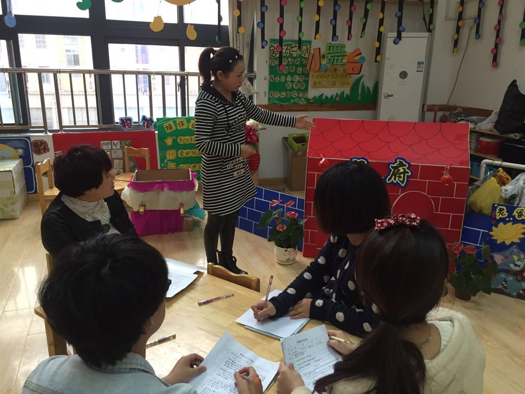 如何让幼儿能够愉快的进行表演?创设丰富的表演场景以及充分准备材料是相当重要的。由于中班的表演场景丰富材料充足,我们让该班老师介绍了她是如何创设表演场景,制作相关的表演材料。接着我们提出了几个在指导幼儿自主表演的过程中遇到的难题,在制作和选择材料上的困惑,小组成员一起讨论解决。最后我们决定利用中班表演场景,让老师自己来表演“老鼠娶亲”这个故事,在老师体验表演乐趣同时,想出新点子让幼儿能够更好的表演。