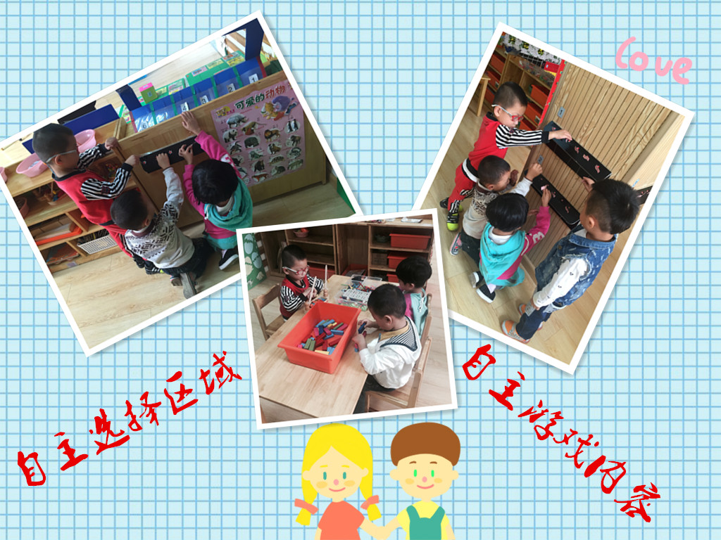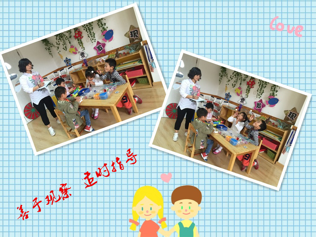 经过研讨,大家都认为区域游戏是最能体现幼儿自主性的游戏,那么教师在指导的时候也应该把握好儿童观,充分尊重幼儿,给予幼儿自主选择的权利和自由游戏的空间。比如:材料推进策略鼓励教师、孩子、家长一起搜集材料,材料的准备尽量是低结构、开放性的材料,结合不同的年龄提供不同种类、不同层次的材料;游戏介入策略是指教师通过游戏者的身份利用“平行式介入”或“交叉式介入”的方法参与幼儿游戏;语言指导策略是教师尝试运用“建议式”“鼓励式”“澄清式”“邀请式”“角色式”“指令式”等不同的语言指导游戏。