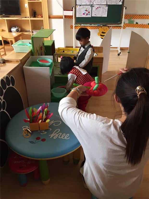 当晨晨直接用手抓馄饨时,指导教师便以“客人”的身份介入了游戏。教师:“老板,馄饨是刚煮好的吧?都在冒热气呢,肯定很烫,老板你小心烫伤了手啊!”孩子听到我这样说,想起用勺子舀馄饨。当晨晨把“教师”的馄饨端出来后,教师又说:“老板,这馄饨怎么脏的?是不是因为刚才你用手抓过了,弄脏了,这馄饨怎么吃?我不要了!”晨晨没说话,把馄饨端走了。从观察到的现象中,可以看出虽然孩子进行买卖游戏的角色扮演,同时吃馄饨的生活经验也是有的,但是可能对于厨房内的操作规则并不了解,或者只是简单的了解并没有去重视它,以致直接用手抓馄饨。幼儿园附近就有一家如意馄饨,并且是敞开式的厨房,建议可以带幼儿去馄饨店吃饭,并进行细致得观察,亲身体验,增加生活经验。