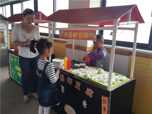 例子:轩轩和晨晨小朋友选择了双桂坊的“如意馄饨店”进行游戏。轩轩说:“快来买好吃的馄饨哦!如意馄饨最好吃哦!”这时,正在旁边烧烤店买烧烤的的琪琪小朋友拿着烧烤串走了过来,站在馄饨店门口踮起脚尖看着里面。轩轩看了眼琪琪,说:“要吃馄饨吗?”琪琪点点头,轩轩说:“你要吃什么馄饨?”琪琪举起左手抓了抓头,说:“我要吃青菜的”。轩轩对晨晨说:“她要馄饨”,晨晨打开锅盖,抓了一把馄饨放进锅里,盖上盖子。一会晨晨打开锅盖,用手抓起了馄饨,放进碗里。