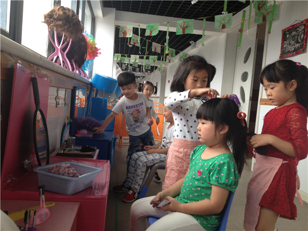 我园是生态理念下的主题性游戏,强调从幼儿经验和生活出发,凸显“自然、原色、自主”的游戏活动,并且与主题活动的内容很好的融合,那么孩子们的游戏内容不再是单一的、零散的,而是丰富的、深入的、生态的,这样的游戏活动能有助于幼儿学习、生活、社会性交往能力的发展,有助于教师依据生态理念、主题目标更深入的开展相关的角色游戏活动,寻得相应教学策略等。在一系列角色游戏的开展中,我们不难发现它的不确定性使很多老师在组织游戏时常常处于“如何判断”和“如何应变”的紧张状态。尽管教师已经拥有了一定的开展角色游戏的经验,但在具体的组织实施中还存在一些问题,往往不能充分发挥游戏的教育作用。面对这些问题,我们分别从小、中、大班分别开设了班级进行游戏活动的研究,那面就以我园中班年龄段角色游戏——小海发型、双桂坊为例:
