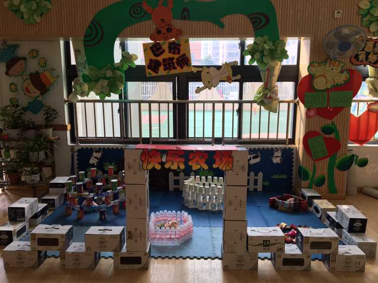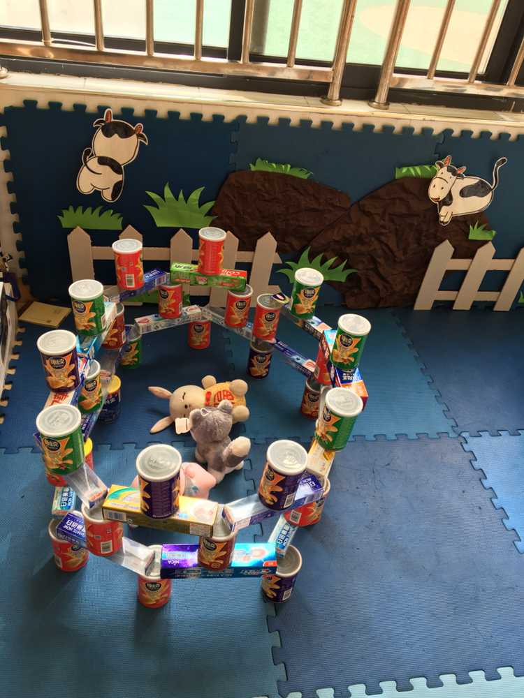 近日,采菱幼儿园小一班的孩子们正以“快乐农场”为主题进行建构游戏活动。本次游戏“快乐农场”是在“我喜欢”主题中生成的,“小动物的家在哪里?”“小动物的家是什么样子的?”孩子们一个个好奇的问题拉开了游戏的帷幕。活动中,孩子们手中的建构材料没有鲜艳的色彩,没有奇特的造型,而是选择了我们平时所扔弃的废旧物品,如养乐多空瓶、薯片桶、香烟盒、牙膏盒、一次性纸杯,还有特伦苏空箱(感谢家长朋友们为本次游戏收集的废旧物品)。游戏开始时,孩子们自由选择自己喜欢的毛绒小动物,游戏中自主选择建构材料,开始了为小动物建造“家”的活动,游戏中,孩子们用最简单的材料体会着最简单的快乐 。“生态建构”崇尚自然纯朴的美,遵循小班孩子的兴趣需要,进行原味建构。