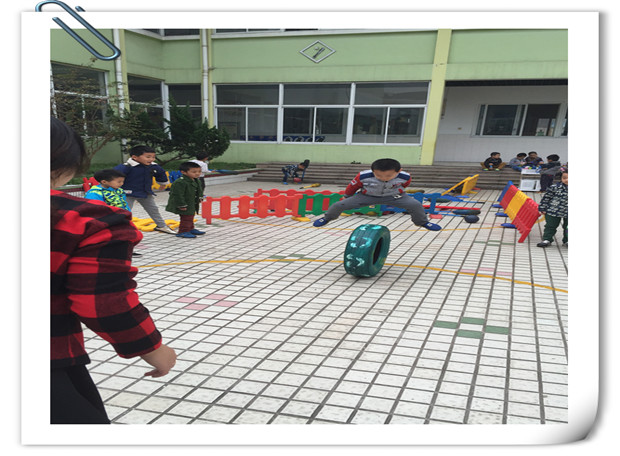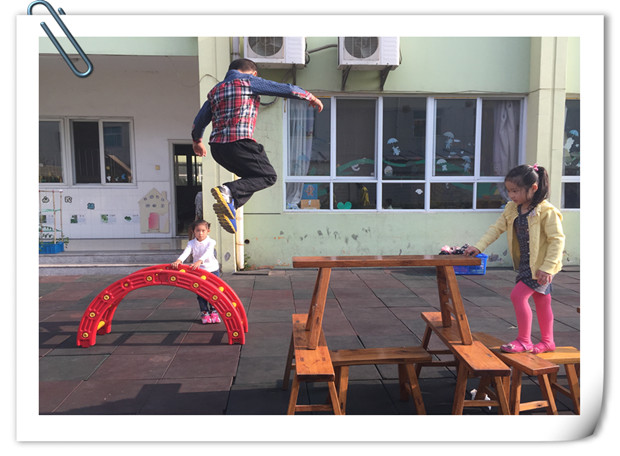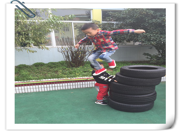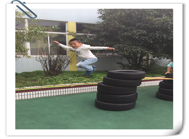 我们的孩子在玩转“跳跃”动作的时候,不光是从力度、速度还是动作和身体部位的整体协调上,都可以看出孩子们对于这个动作的兴趣程度,就简单一个跳跃的简单动作,孩子们从自己喜欢的角度去释放自己的动作技能,依靠不同的运动器材---不同长短、高矮的长凳和黑色、花式轮胎,不同的跳出了新的高度,看,有的孩子将双手紧夹后背,像小翅膀一般的跳跃出去;有的孩子摆出了像一只老鹰般的张扬动作;还有的胆小的女生是轻轻的双手紧握着慢慢着地,其中有一男小朋友敢于挑战属于他自己的“旋转式”的跳跃,落地那一瞬间稳稳的着地,老师和同伴的心可是一拎,那可谓是将动作做到了极致,不仅锻炼了跳跃的动作技能,还在安全自我保护方面给与自己一个挑战。这位幼儿的跳跃榜样,同伴们争先恐后的来进行该动作的尝试,连平时胆子极小的徐岩也加入了跳跃的行列。