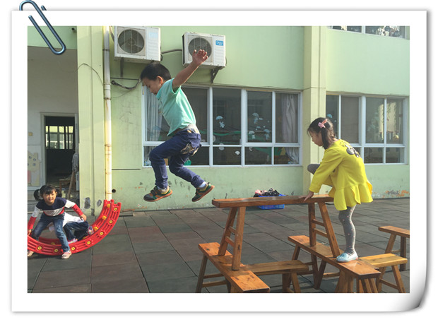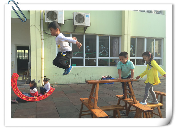 大班幼儿目前能够做到起跳时双手有意识的摆动、与腿的配合较协调。但最终需要发展到熟练掌握跳跃动作。起跳有力,动作协调,落地轻稳。并且能够掌握向不同方向变换跳,跳的准。为孩子们的勇敢精神给予一份鼓励和支持;为我园的生态运动游戏增添一份自主、原色的精彩吧!