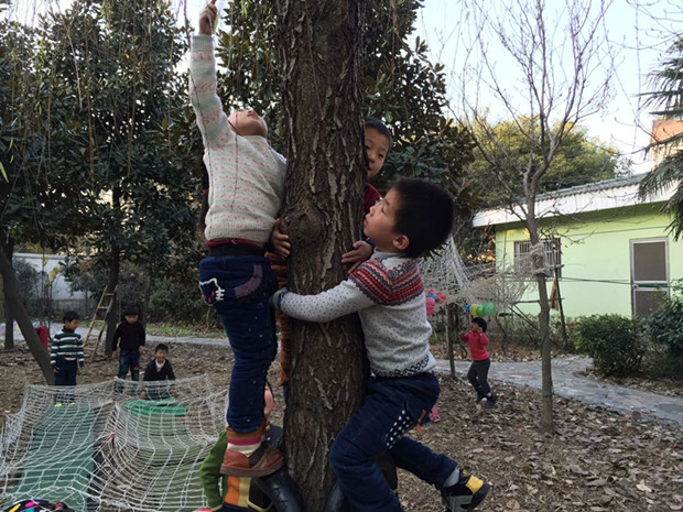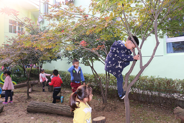 然而我们雕幼的孩子可不是这样,他们能够自由地走进大自然、拥抱大自然,在小树林里嬉戏野战、在小池塘边戏水玩闹、在小木桩上跳跃玩耍。瞧!大班的孩子们真厉害,他们在比赛爬树呢!只见孩子们各个身手敏捷,“跐溜、跐溜”就爬上了树。成功爬上树的孩子们,流露出激动和喜悦之情。树底下的孩子们一边为他们加油喝彩,一边跃跃欲试。慢慢地想要爬树的孩子越来越多,把整棵小树都包围了起来。不过,大班的孩子可是很有规则意识的,他们排起了队伍轮流玩了起来。