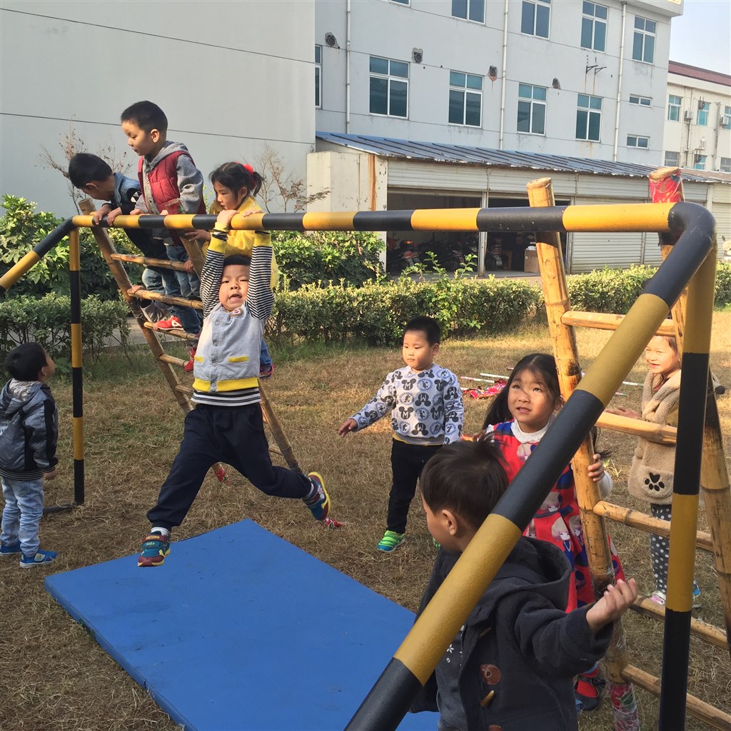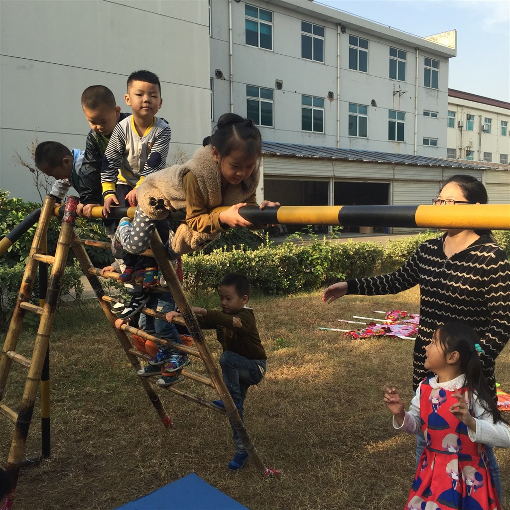 晨间游戏开始啦,教师提供各种运动器材如:竹竿、平衡板、轮胎、梯子、滑板车、足球、沙包、垫子等让幼儿自主选择。教师们还预设了“登高投篮”、“纸球对垒”、“翻山越岭”、“轮滑滚滚乐”、“鲤鱼跃龙门”“蚂蚁运粮”等游戏内容供孩子们自由选择。孩子们迎着暖和的阳光,踩着欢快的音乐,选择自己喜欢的游戏材料进行游戏。在这里,他们邂逅了不同班级的小朋友,瞧,刚刚还是怯生生的对视,一会儿便在共同的游戏中手拉手成为新朋友。他们彼此相互交流,相互帮助,兴奋着、忙碌着,跃跃欲试地尝试着不同的运动游戏。孩子们自由选择器材进行组合,生成新的游戏,它反映出教师能充分尊重幼儿的兴趣需求,不断捕捉幼儿的游戏热点,追寻幼儿的游戏发展与变化。在这里,玩什么、和谁一起玩、用什么玩,完全由幼儿自己协商决定,充分实现了幼儿“玩自己的游戏”的愿望。在不同的场地都有值班的教师,她们负责孩子们的游戏秩序和活动安全,随时关注着孩子们的一切动向,为孩子们尽享游戏的甜蜜保驾护航。