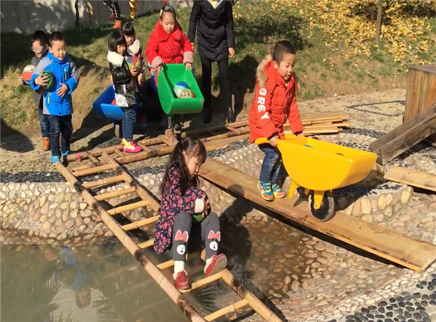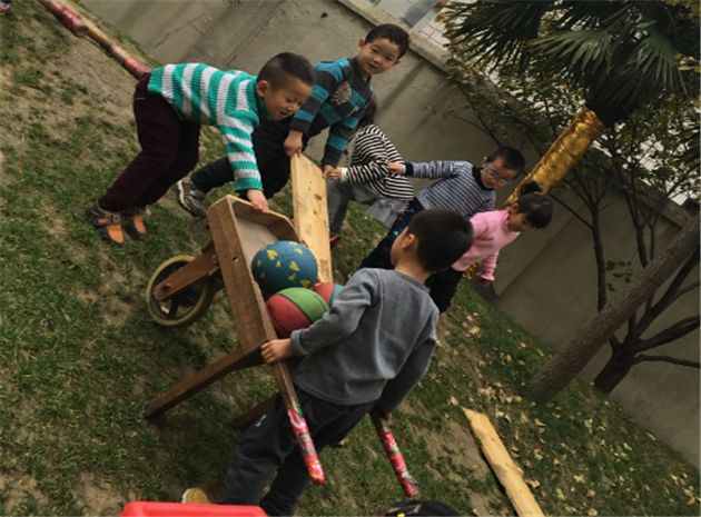 来到“小河”边,小朋友们两两合作,有的把竹梯架在池塘边,有的把长木板架在池塘边,推着小推车小心翼翼地度过了河。经过这么多困难,终于把粮食运到了粮仓。本次游戏的设计意图是通过爬坡运粮锻炼上肢力量,推车过小河锻炼平衡力。中班幼儿已能够在较窄的低矮物体上平稳地走一段距离,这次过小河的游戏在原有的基础上增加了难度,要求幼儿推着小车过窄桥,对幼儿的控制力以及身体平衡力提出了更高的要求。这一高挑战项目激起了幼儿更大的兴趣。