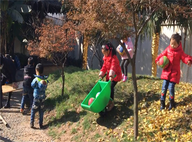 我园生态运动游戏倡导“自主、自由、原色”,因此教师学会适时放手,在游戏中起支持者、引导者的角色。快乐农夫们来到小山坡,他们要把粮食运到山那边,这可难不倒聪明的农夫们,他们利用小推车、轮胎、塑框等工具,把粮食放进里面推上小山坡,可是因为前些天下了雨山坡有些湿滑,小推车怎么也推不上,这时一些小朋友先爬上山,再拉着下面的小推车上山,这样一拉一推,满载粮食的推车很快翻过了“小山”。