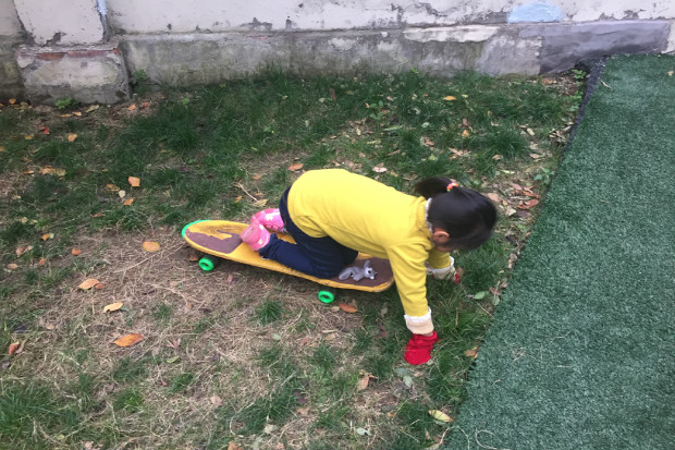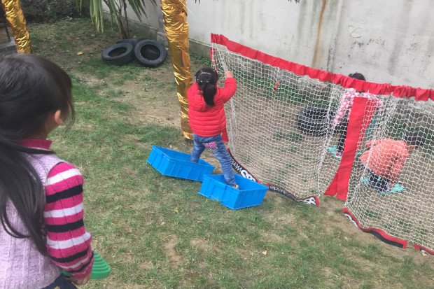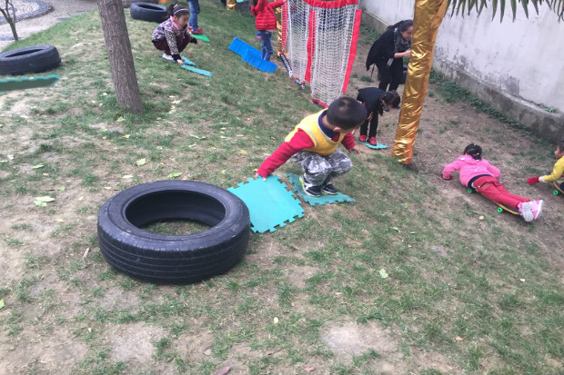 在本次中心园生态运动游戏的开展过程中,各位优秀教师各显其能,想出了很多有趣的生态运动游戏,幼儿积极参与,玩的不亦乐乎。本班根据这周动物主题开展了《拯救小动物》的生态运动游戏,活动地点放在了幼儿非常喜欢的小山坡,运用小山坡以及小山坡中的树木、网、轮胎等环境。教师创设了小山坡已被坏人污染,小动物受困于小山坡的游戏情境,吸引幼儿主动参与,争当小英雄,拯救小动物。在活动中,幼儿因为身体各部分都不能触碰地面,所以教师提供了丰富的材料,比如:梯子、塑框、轮胎、小垫子等等。在教师的一声令下,各位小英雄开动脑筋,选择材料,拯救小动物。在拯救过程中,小英雄们不怕脏不怕摔,跌倒了站起来拍拍泥,继续往上爬。路尽了,开动脑筋想办法继续铺路。小动物藏得太高,小伙伴就一起帮帮忙。小伙伴运用自己选择的材料,克服种种困难,想尽办法爬上山坡,帮助受困的小动物脱离险境。
