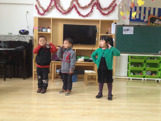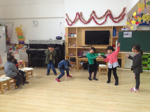 今天的观察范围主要落在表现区的“梦想舞台”。4个男孩和1个女孩选择了在处此游戏。录音机里依次播放孩子们平时熟悉的歌曲或者乐曲,有《头发肩膀膝盖脚》、《加油干》《小树叶》、《郊游》、《洗澡歌》、《健康歌》、《水族馆》等。5个孩子根据自己的喜好,有的做小观众,坐在观众席上玩乐器或者随音乐打击乐器伴奏;有的孩子做演员,根据随机播放的音乐或唱或跳或玩音乐游戏;表演累了的孩子会自觉去观众席休息或打击乐器为音乐伴奏;做观众的孩子每每听到自己感兴趣的音乐,就会不由自主地冲上舞台做小演员,边唱边做动作表现自己对音乐和歌词的理解。中一班教师选择的歌曲很受孩子的喜欢,临近“梦想舞台”的动手区的孩子时而也会被吸引过来自然加入表演的队伍,自己喜欢的音乐结束,其他区的孩子又会自然回到原先的区域继续游戏。一切是那么自然、一切的游戏行为又是那么的真实,孩子在与音乐、与乐器、与伙伴的互动中,艺术素养逐步提升,表现能力日益增强,开朗、自信、合作的品质也都由此得到发展。