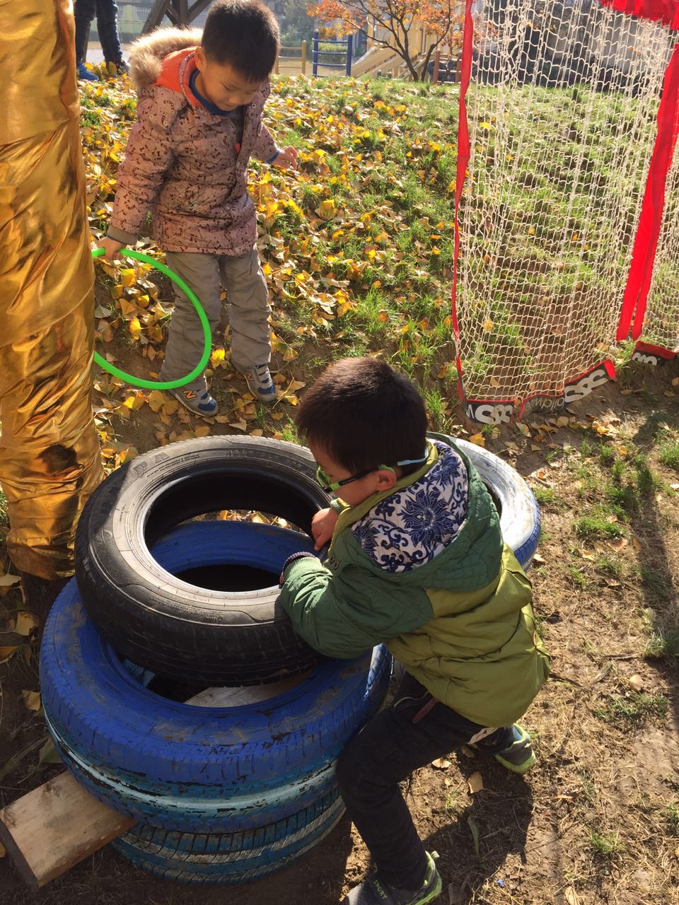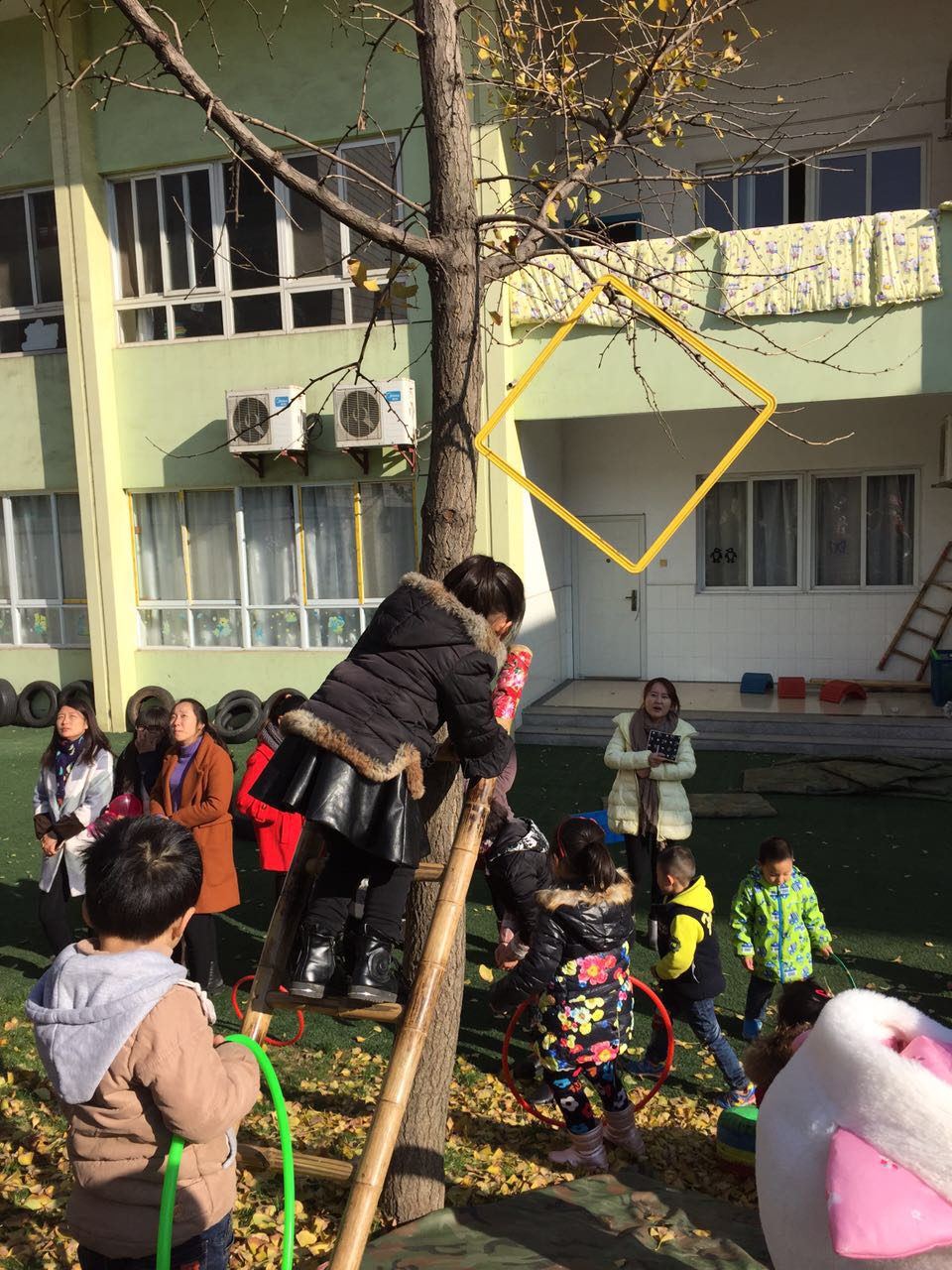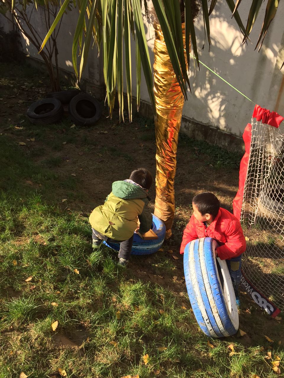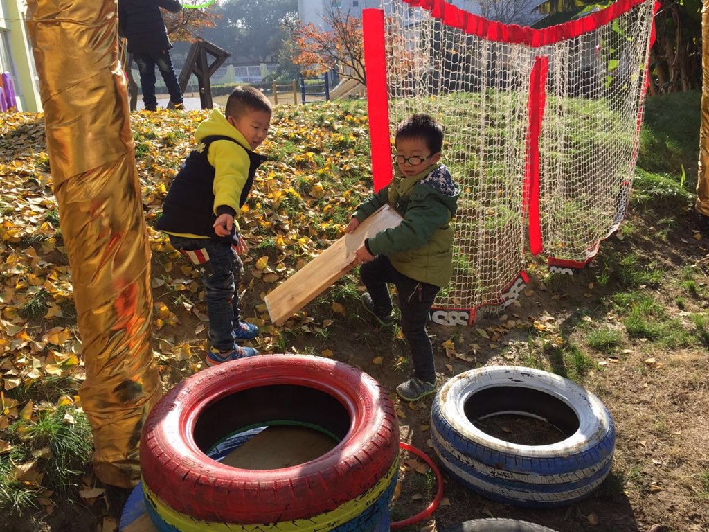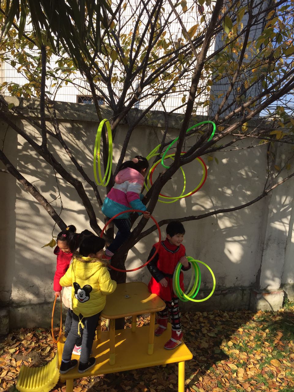 在游戏中,我们让孩子自由选择材料,材料也是非常原生态的,都是废旧材料的重新利用,让孩子在大自然中获得有益于自己的身心经验,活动过程中有的孩子利用梯子爬高,有的孩子利用轮胎和木板的组合搭建,有的孩子拿起了桌子搭建,纷纷上树,用手中的彩色圈来装饰,原本已经叶子全部凋零的大树,在孩子们的共同努力下变得五颜六色十分漂亮。