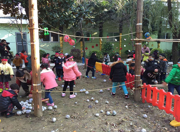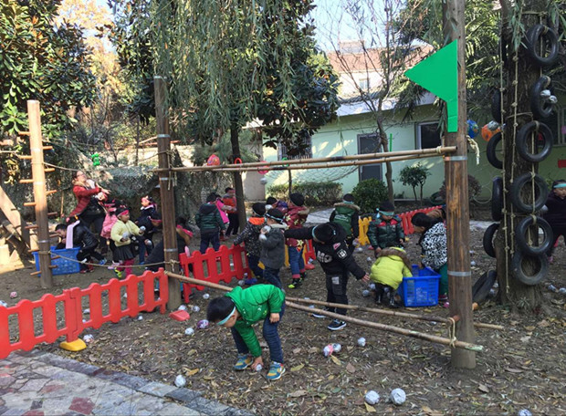 游戏前,我们让家长和孩子一起制作一些报纸球,并把这些报纸球藏于小花园中,让材料与环境很好的相融合。游戏中让幼儿自愿分成红绿两队,进行对战。首先孩子在寻找“子弹”的过程中进行了爬一爬、跳一跳、走一走、跑一跑的热身;其次在激昂的鼓声当中,开始了两队之间的对战游戏,体验到了当战士的感受,玩投掷游戏的快乐。教师也适时参与游戏之中,隐性指导着孩子如何进行投掷活动。记得林永哲教授 “玩性”教育中提倡到:给孩子时间和空间,让他们自己安排;给孩子问题和困难,让他们自己去解决;给孩子对手和冲突,让孩子自己去竞争和处理。听着源源不断的鼓声,看着孩子们活跃的身影,冬日的寒意在这里逐渐被融化……