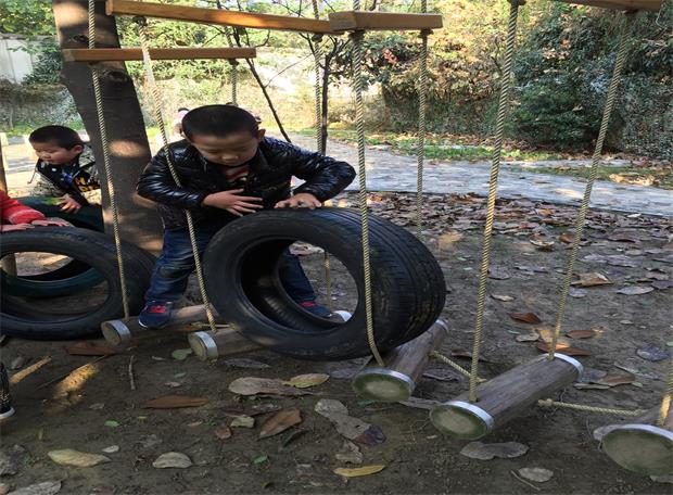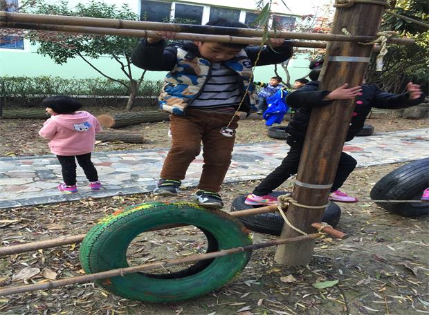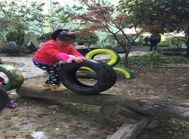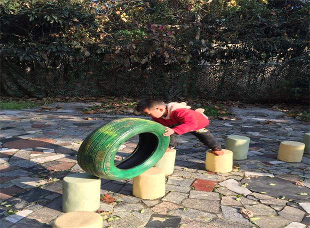 在小花园中,有着孩子们可以挑战“王牌特工”的各个特殊项目,利用大小不一的轮胎在五个不同的游戏区域进行轮胎的“滚”挑战:通过敌占区-------过黄河------爬高山------走独木桥--------穿越梅花桩,看似游戏材料准备比较简单,滚轮胎很简单,但材料与环境相结合的游戏点子比较新颖,也能玩出游戏新花样。当轮胎“滚”过每个区域时,还是比较有难度的,对于幼儿的平衡和力量有极强的挑战,通过这样一系列的游戏,既发展了幼儿的动作协调、平衡、控制等运动能力,又体现出了合作、坚持、勇敢的运动品质。