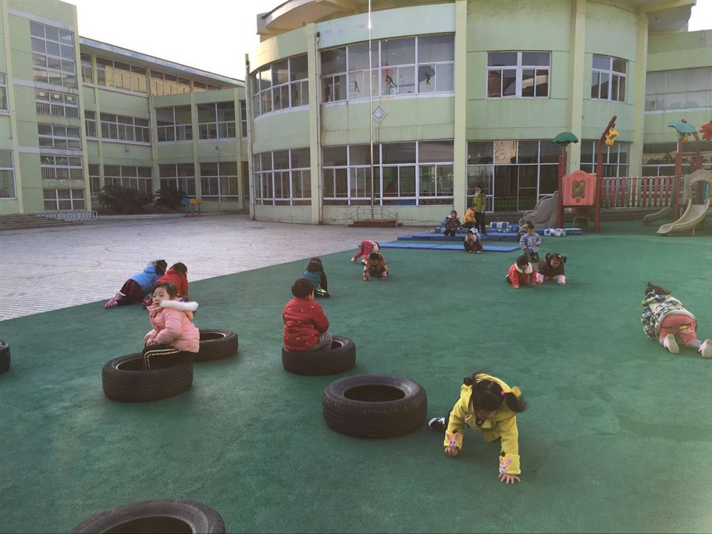 我们小一班的生态运动游戏以“海洋和沙滩”为游戏背景,以“小海龟产蛋”为游戏主线。老师将园内的一块操场的东面布置成“海洋”,西面布置成沙滩,让幼儿模仿小海龟尝试从沙滩爬向海洋寻找蛋,然后再把蛋拿在手中,爬回沙滩中自己的窝里去孵蛋。孩子们置身于游戏中,像小海龟一样快乐的爬来爬去。