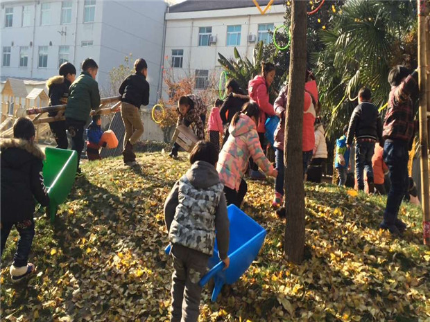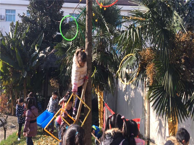 随着教师的一声令下,幼儿全都冲上了山坡寻找成熟的“粮食”。有的幼儿搬来竹梯,手脚并用地爬上树将树枝上的“粮食”摘下;有的幼儿将几个轮胎或是塑料箱子垒高,伸手去够枝头的“粮食”;有的幼儿找来竹竿,将树上的塑圈一一挑下;有的幼儿二话不说,直接爬上了树采摘。“这个粮食太大了,我搬不动,你能来帮帮我吗?”、“这个竹竿晃得太厉害了,你能和我一起挑吗?”、“我的小车快倒了,我们一起推吧!”。大家我帮帮你,你帮帮我,不一会儿就把粮食全都采摘下来并运回了农场。“我们一组运得多!”、“我们大家都多,我们就算平局吧!”大家全都沉浸在收获的喜悦之中。