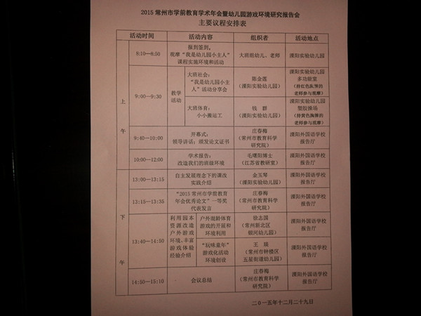 2015年12月29日,坐落在美丽溧阳天目湖畔边的溧阳实验幼儿园,迎来了“2015年常州市学前教育学术年会暨幼儿园游戏环境研究报告会”。常州市幼教年会,吸引了来自常州市各个区的骨干教师参加,2年召开一次,规模大,层次高。此次年会的主题,主要围绕“幼儿园游戏环境”进行研讨交流。