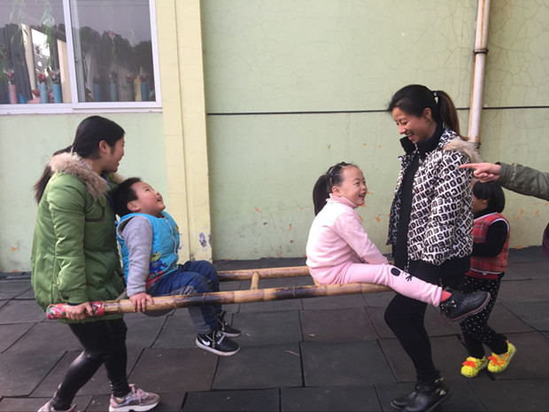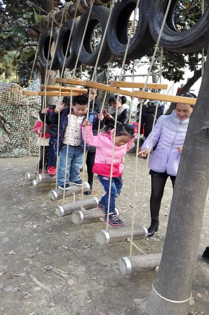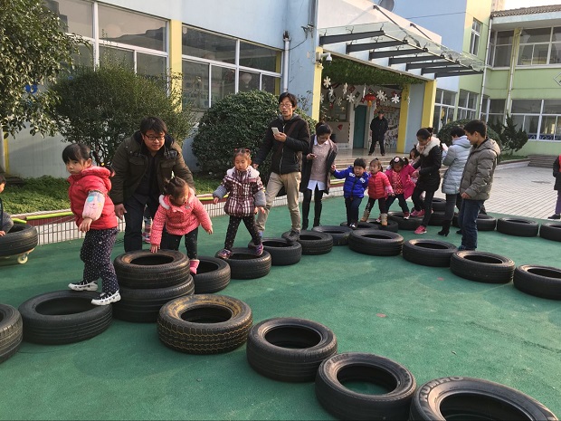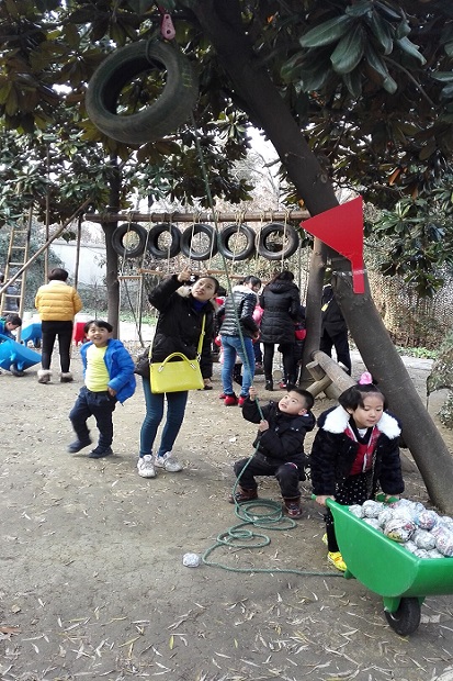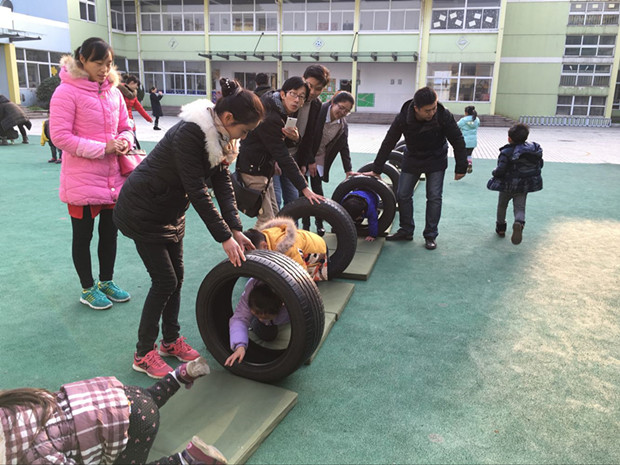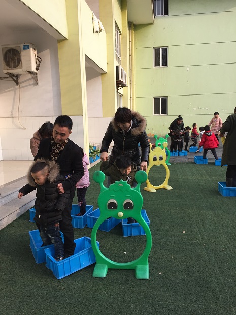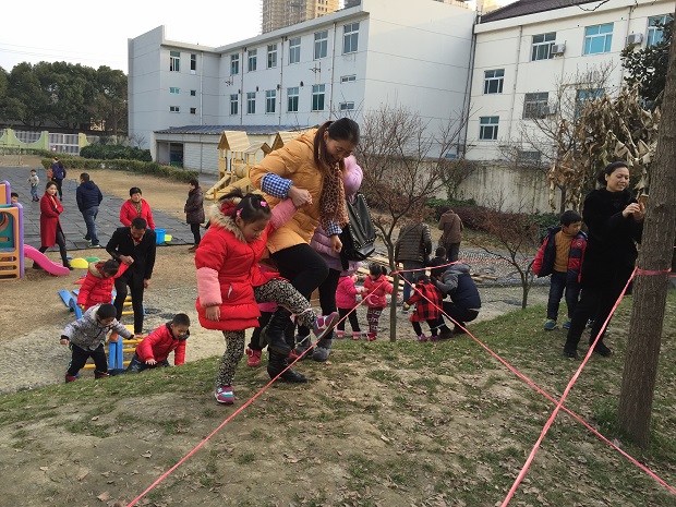 本次亲子游戏,中二班选择的场地是平时孩子们最喜欢的小山坡。小朋友和爸爸妈妈在这里“齐心协力摘果果”,爸爸妈妈和孩子把腿绑在一起,越过障碍、翻过山坡、越过“封锁线”,两人合作把“果子”运回来。玩过了这个游戏,山坡下面还有有趣的“穿大鞋”游戏,小朋友和爸爸妈妈一起穿上塑筐做的“大鞋”,要绕过障碍才能达到终点,这两个游戏都需要家长和幼儿密切配合才能完成。玩过了本班游戏,班级与班级之间可以互相交换,玩一玩其他班的游戏。中三班开展的是“我变小矮人”“抬小猪”“翻山越岭”,小朋友和爸爸妈妈与竹竿、竹梯玩各种游戏。还有中四班的“轮胎”游戏也是孩子们的最爱,小朋友和爸爸妈妈一起“拖小车”,走“快乐小路”,钻“山洞”;中一班的游戏在小花园开展,小朋友先在“占地训练营”练习本领,然后收集好“弹药”开始“子弹大战”。
