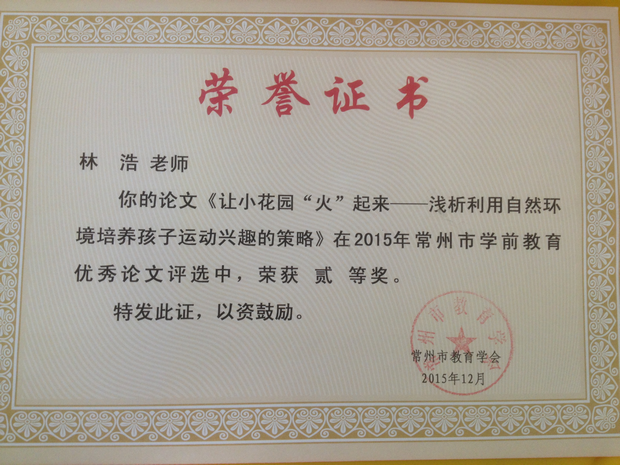 2015年10月,此论文获常州市学前教育优秀论文评比二等奖。