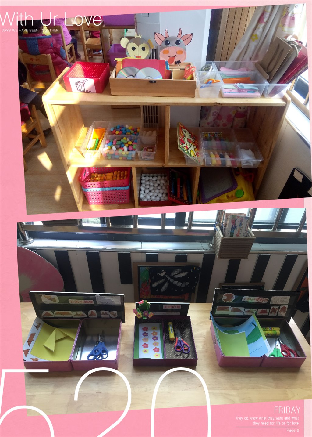 美工区的材料较为繁复,如果老师不能有意的设计摆放方法和位置,就会让幼儿无从下手,或是不利于幼儿养成良好的行为习惯,特别是对小班幼儿来说更是如此。因此,美工区材料的放置要井井有条,相对稳定,这样便于幼儿拿取和归还原处。为了让美工区的东西一目了然,便于幼儿取放,老师使用有不同分隔的盒子或小塑料筐,比如,不同颜色的彩纸放在多格的盒子中,剪刀、浆糊棒、擦手用的小毛巾放在多格的工具盒里,各种各样的美工绘画纸可以按照它们的种类及难易程度分别用托盘装好。这样幼儿在使用和归还物品时就会感到轻松,也便于教师随时检查幼儿使用材料的情况,并及时补充以免出现材料不足的情况。