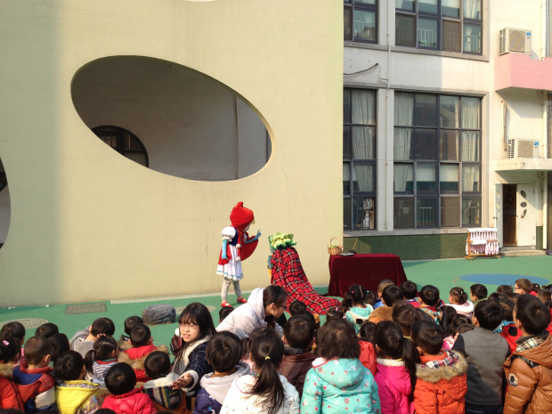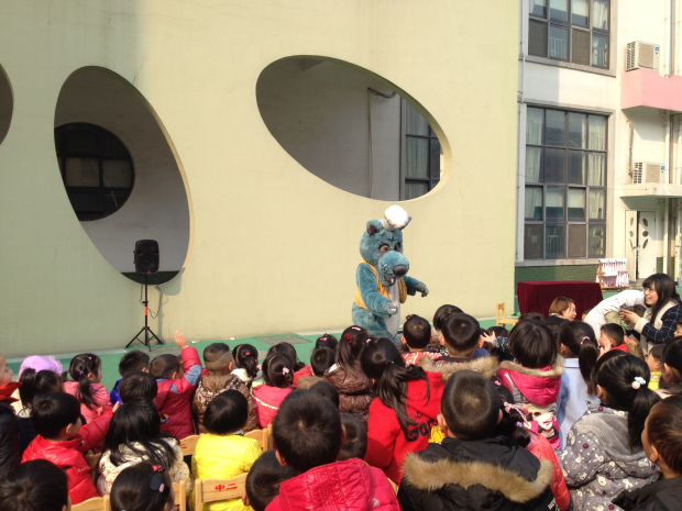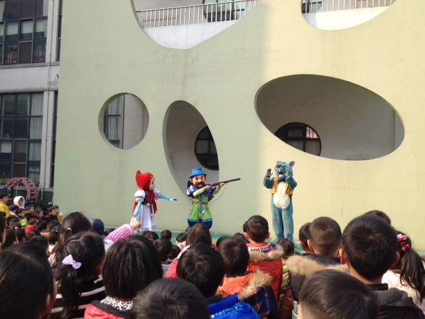 随着背景音乐的想起,大灰狼漫步走上舞台,这只大灰狼可不是童话故事里的那只哦!他可是一只有梦想大灰狼,他的梦想是尝尽天下的美食,练就一手好厨艺。他善于欺骗和表演,想要将森林里的小动物和孩子们都变成自己的美食。说完这句开场白,引得台下孩子们的一片唏嘘!“大灰狼,你是大灰狼,我们才不怕你呢!”“你是欺负小动物们的坏蛋!”看来大灰狼可恶的坏形象已经深入人心。伴随音乐的再次响起,可爱的小红帽出场啦!孩子们都非常喜欢她呢,都在提醒她小心大灰狼!接着大灰狼使计将好心的猎人骗走,想将小红帽做成美食,当得知小红帽要去外婆家时,大灰狼又将目标瞄准假扮外婆。当大灰狼自以为假扮外婆能骗过小红帽时,小红帽用自己的聪明才智巧妙地将猎人引过来了,大灰狼只好灰溜溜地走掉了。