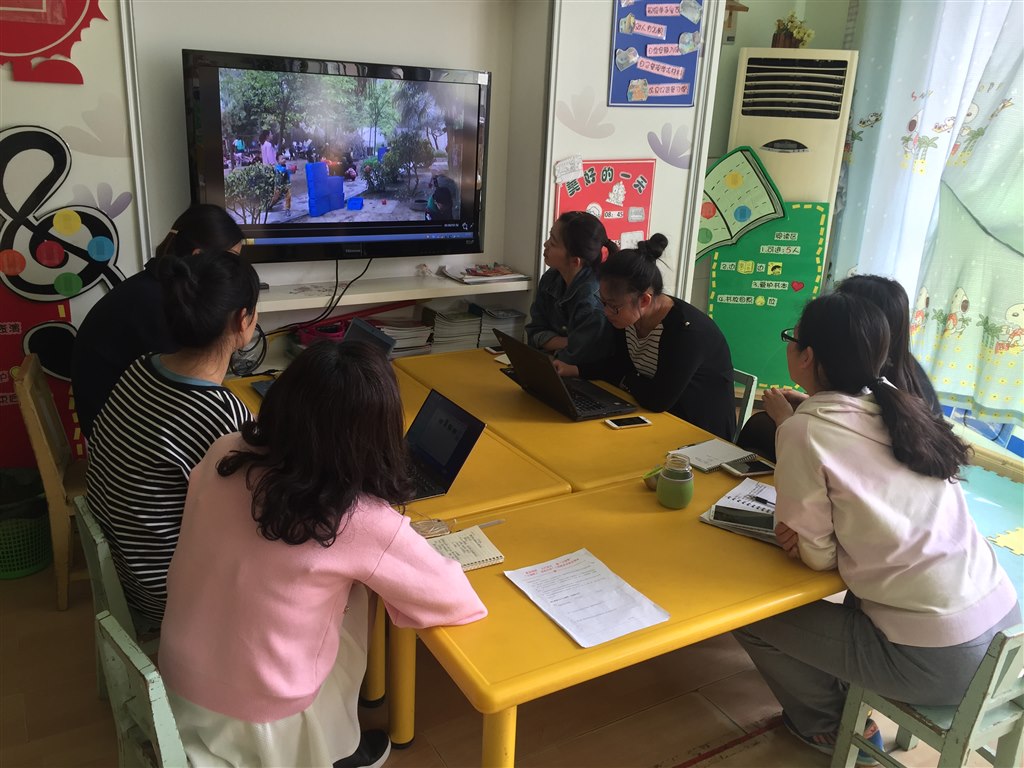 视频分享后教师们一致认为中一班和中三班的游戏较为突出,一起对游戏在游戏器材和游戏形式上进行了商议调整,最后大家认为中一班的游戏场地场地可设在山坡上,在树与树之间拉线,在生态的环境下回更加适宜。中三的游戏重点放在投高这个维度,可以增加一些攀爬架、梯子等材料丰富幼儿投掷活动。