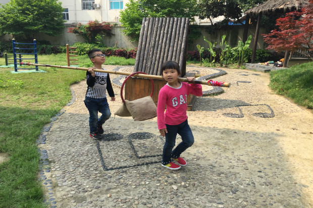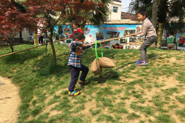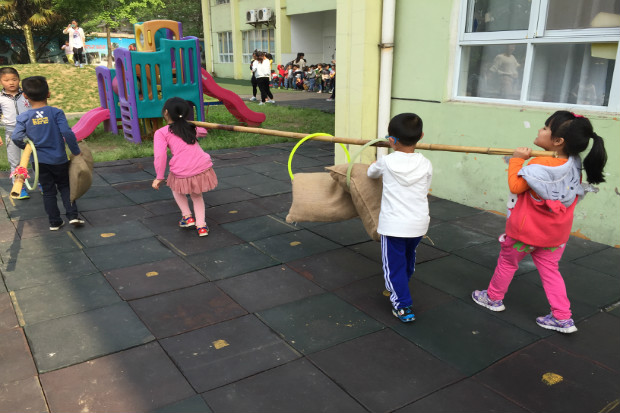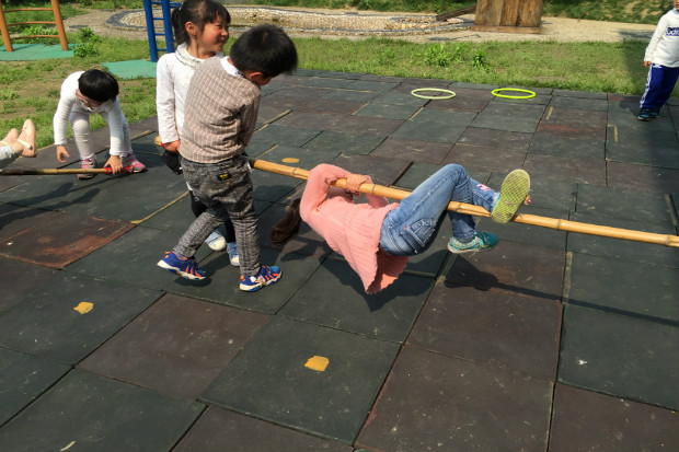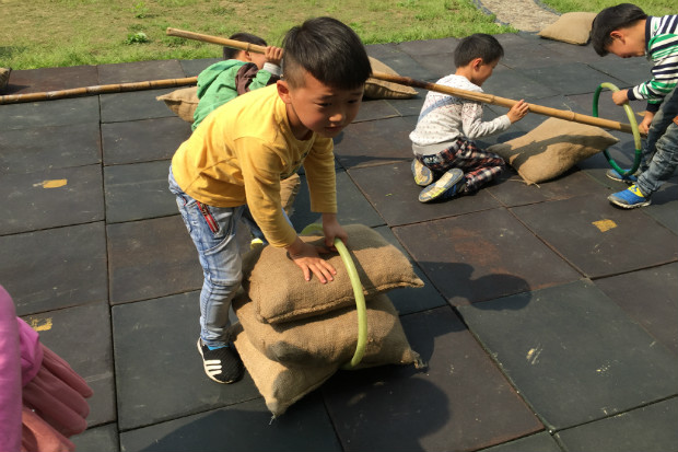 随着本园生态运动游戏如火如荼开展,大四班邹老师与小朋友一起开展了“挑山工”的游戏,孩子们积极参与,兴趣极高。利用“堵洞口,抗洪水”的生动情境,激发幼儿游戏的兴趣。利用生活中常见的竹竿,两两合作挑沙包,并且翻越山坡,运至“洞口”。在第一次合作运沙袋的基础上,邹老师又将游戏提升了一个难度,创设“感染病毒,转移伤员”游戏情境,利用竹竿,三人一组,两人合作运“伤员”,“伤员”手脚并用,抓住竹竿。既考验“挑山工”,又考验“小伤员”的手部力量与身体协调性,将游戏推向高潮。整个游戏过程,“小挑山工们”积极合作,努力完成任务。