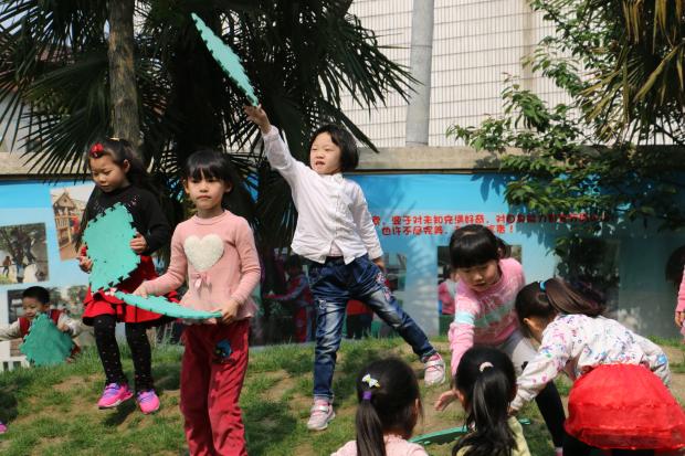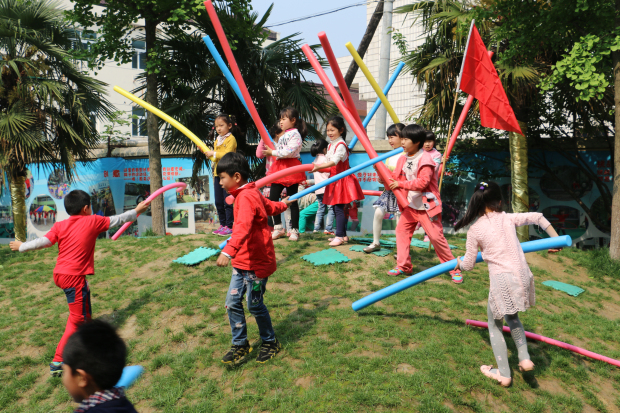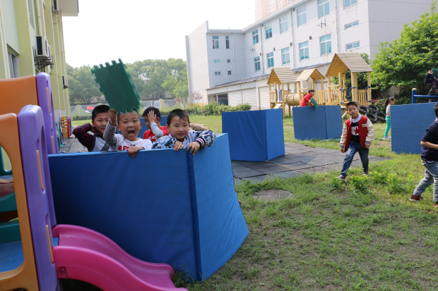 美丽的四月,春光明媚,幼儿园里一片生机勃勃。大三班的孩子们聚在小山坡边和林浩老师正在玩“坚守高地”的生态运动游戏,孩子们快乐的嬉戏声此起彼伏。今天的游戏共分为三个层次,首先是孩子们自由选择泡沫垫,向“敌方”投掷。这一层次的游戏目的是让孩子们能够融入游戏的角色,明确自己今天的任务。随后,我们将游戏的场地拉伸,形成一个立体的空间。伴随着紧张的空袭警报声,树上多了几架“敌机”,此时已有角色意识的孩子们自然而然的就将手里的泡沫垫瞄准了“敌机”,在孩子们的欢呼声中,一架又一架的飞机被击落。当孩子们渐渐对手里的“泡沫炸弹”失去兴趣时,林老师又适时的提出了用海绵棒进行最后的攻击,将整个“守卫”游戏推向了高潮,也让孩子们沉浸在生态运动游戏的乐趣中。
