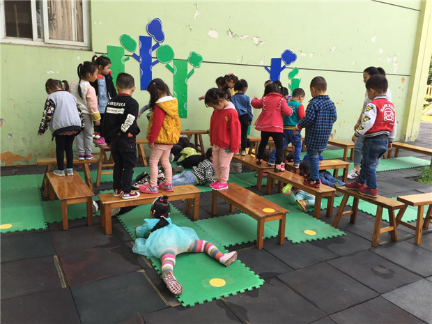 长凳是孩子生活环境中十分熟悉的材料,4月29日上午,小一班的张老师以它为活动器械,将长凳拼成曲折、高低不一的长桥,将垫子铺子长凳下形成迷宫,让孩子们在自主活动的过程中,进行走、钻爬游戏。从而体验运动的兴趣,增强体质,培养幼儿大胆、自信、勇敢的品质。