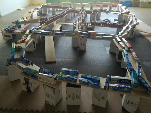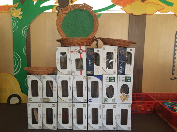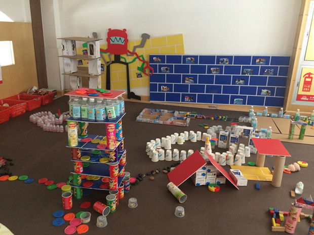 在实践操作过程中,我们发现,有效利用废旧物品来进行建构游戏,比现成的建构玩具更让幼儿迷恋。于是我们着手收集废旧材料,利用家长会让家长了解哪些废旧材料可被幼儿园建构游戏所用,在家长的共同引导下,孩子们每天都拿着装有收集废旧材料的小袋子到幼儿园。不愧是人多力量大,饮料瓶、一次性杯子、各种盒子……源源不断地充实着我们的建构游戏材料。我们利用身边的废旧材料作为建构游戏内容,引导幼儿将废旧材料巧妙地运用到建构游戏中来,为建构活动增添更多的活力。