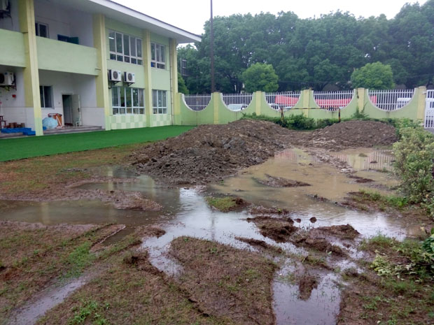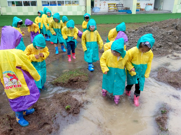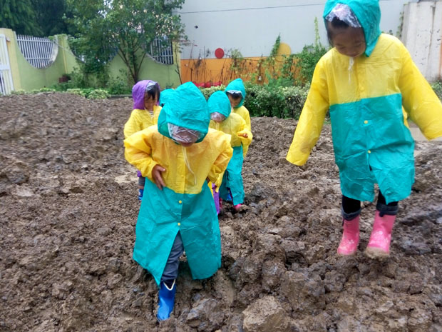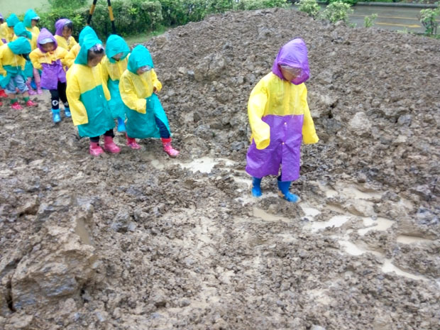 看过“爸爸去哪儿”和“跑男”的人肯定也发现在泥里走路是一件特别有趣的事儿。我园足球场地有一堆即将施工的泥土,因连续几天的阴雨天气,足球上出现了水洼地,也让施工的泥土变得柔软。为了让孩子们体验别样的走泥泞地、踩水洼地等游戏活动,9月30日中一班的小朋友在林老师的带领下,他们穿着雨衣、雨靴,自由快乐的踩着水洼地,用手去接雨滴、走泥路等,在这些游戏中他们比较喜欢踩一踩平时不太走的泥路,感受深一脚浅一脚深别样的味道。特别当他们的雨鞋在泥地里很难拨出来时候,对孩子们来说最刺激,最有挑战性。