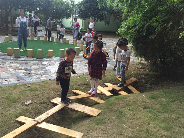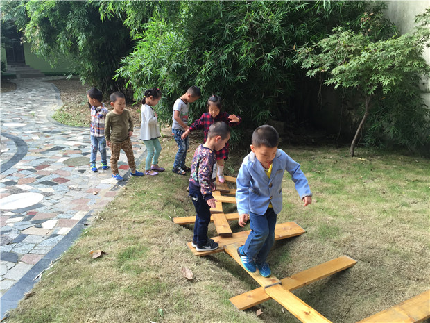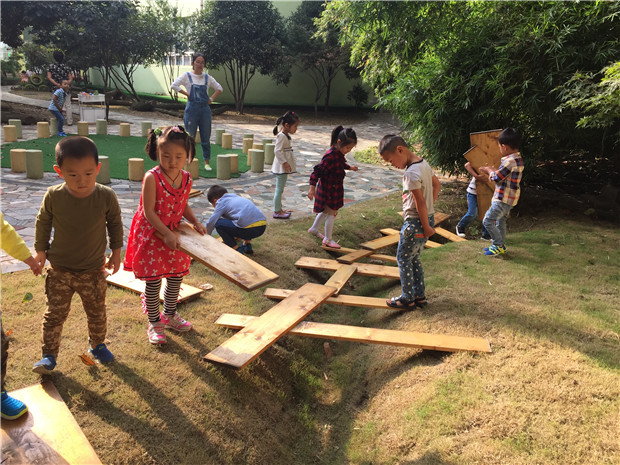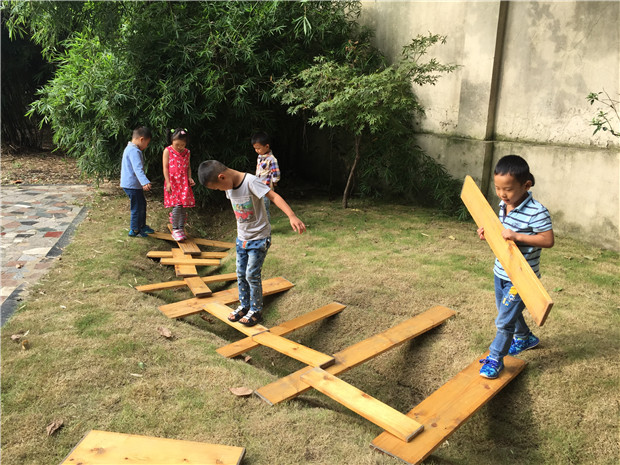 细心的孩子发现,小花园多了一条小沟,怎么样才能跨过小沟抵达对岸呢?聪明的孩子们自发拿来了木板铺在上面,有的横着放,有的竖着放,放好以后跟好朋友一起走一走,真开心呀!