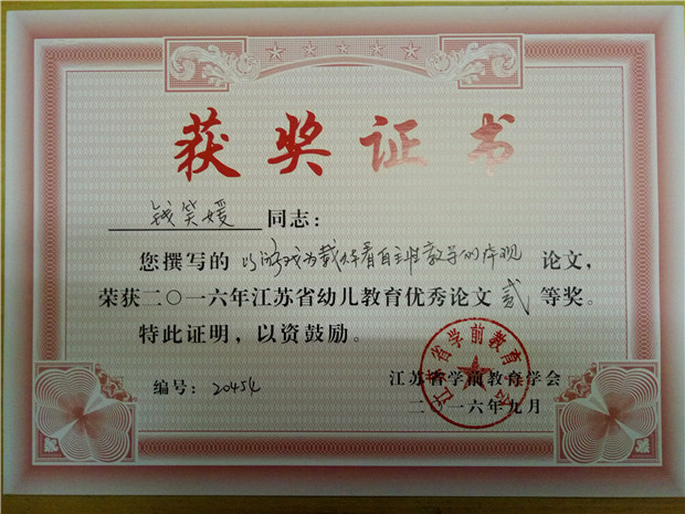 此论文在2016.9获省幼儿教育优秀论文二等奖