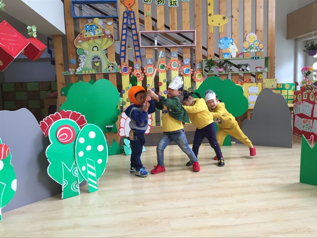 游戏正式拉开帷幕啦,小二、小三班的宝贝们选择表演故事情节简单、对话重复的故事《拔萝卜》,虽然在游戏中表现得很稚嫩,但是他们个个玩得很开心。大班的孩子们选择了故事情节复杂、易于创编、富有教育意义的民间老故事进行表演,如大一班的孩子表演《司马光砸缸》,大二班的孩子表演《葫芦娃》,大三班的孩子表演《三打白骨精》,他们与家长亲手制作了各类栩栩如生的衣服和道具,让幼儿在一定的游戏环境中,在与表演材料、伙伴、成人的互动中不断主动探索,建构统整经验,体验快乐情绪,从角色表达开始,到情景创作,进而推进合作表演的过程。从而使他们的语言表达能力、思维想象能力、动手操作能力等均得到锻炼和提高。