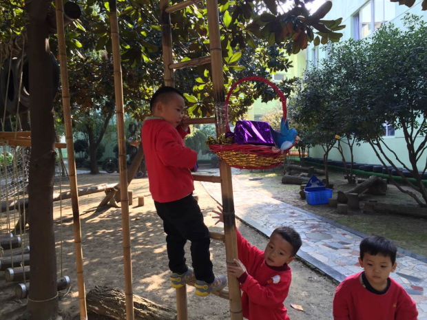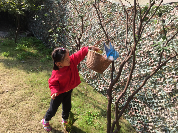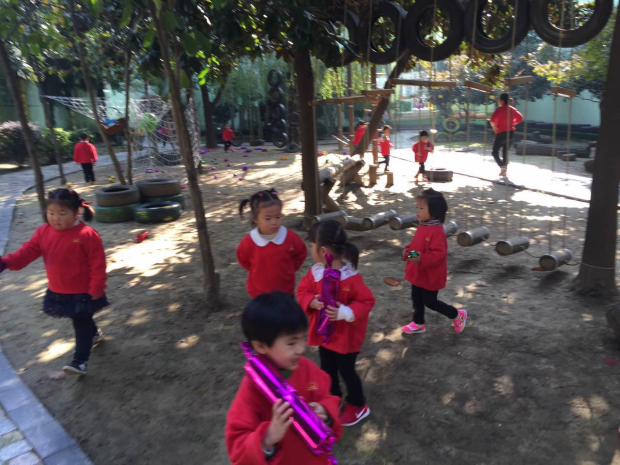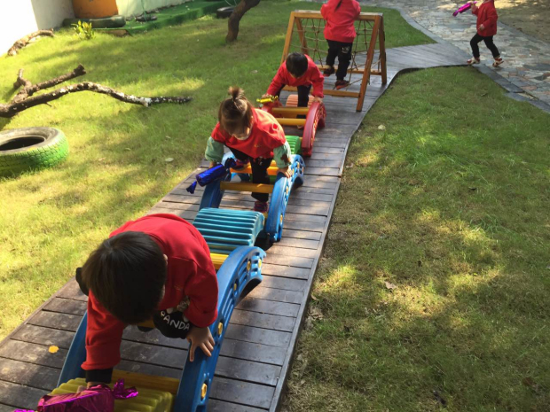伴随着“糖果屋”的欢快音乐,小朋友们玩得热火朝天,有的钻过山洞、爬过隧道,有的踩过小石块、越过拱形桥,有的爬上竹梯、翻上轮胎,还有的小朋友相互扶着走过独木桥。在一片欢声笑语中,我们把糖果都送给了树林里的小动物们。