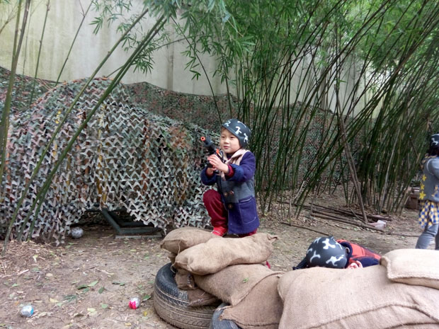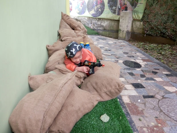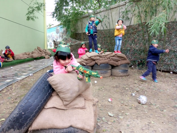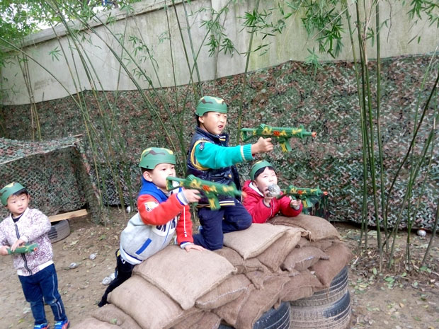 依托我园竹林区的自然环境,并利用沙袋打造了”CS野战区“,并投放纸球、刺毛球等投掷性材料,游戏虽然有效,但孩子们玩几次兴趣性有所降低。为了有效同时有趣的此基础上,11月9日,“迷彩手枪和迷彩帽子搬进了我们班级,吸引了孩子们的眼球。