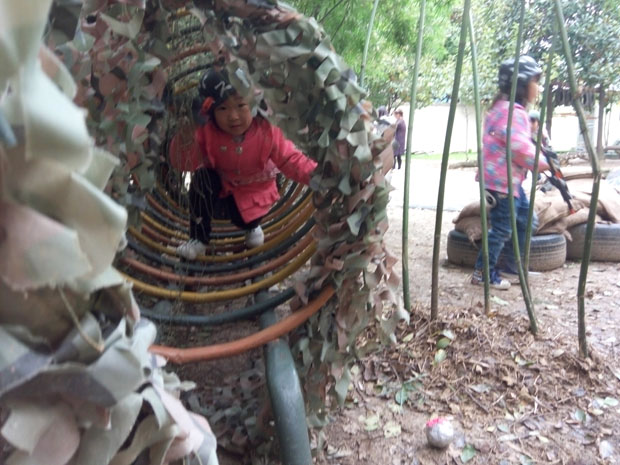 在cs野战区里,孩子们根据环境及不同颜色的帽子进行自由分组,并在自由游戏中生成有情节的游戏。在游戏中发现幼儿的兴趣点;通过本次游戏不仅让幼儿感受到团队合作的快乐,也让孩子的童真得到尽情的释放,初步接触军事知识;更重要的是幼儿在“自由、自主、愉悦、创造”的环境里增强了体质,促进身心的健康。