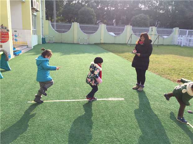 我园是一所体育特色幼儿园,因此健康领域对于我们小班来说是作为重点来抓的一部分,一学期下来,幼儿基本都能自如的走、跑、跳、平衡等。在“体育节”活动中,我们以《指南》为指导,对幼儿进行体能测试,很大程度上提高了幼儿的身体素质。本次我们的测试结合《指南》与区里的《小班(上)幼儿发展水平测试量表》进行,分别测试了单脚跳、双脚跳、走直线、投掷、收拾材料等方面,通过测试可以看出,孩子们基本上还是能够完成相关动作要求的。在单脚向前跳时,92%的孩子都能够坚持跳完