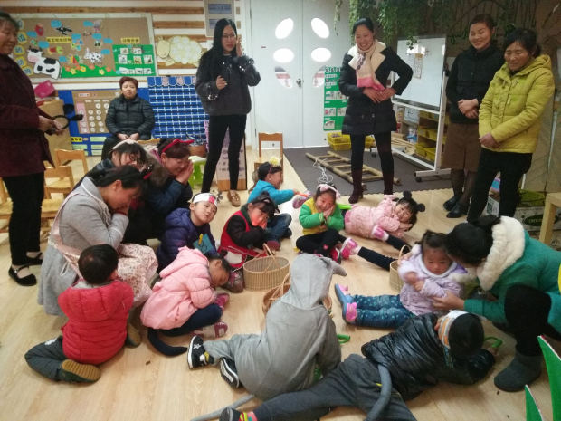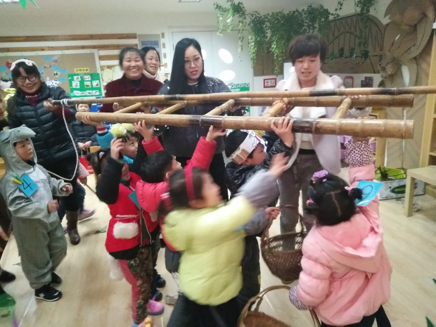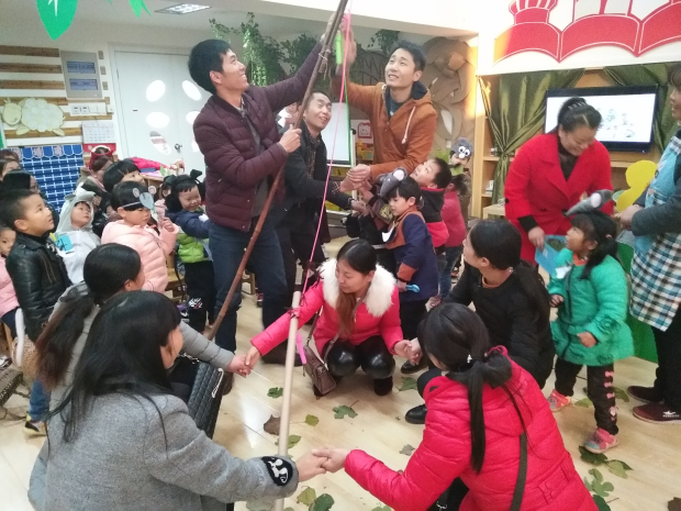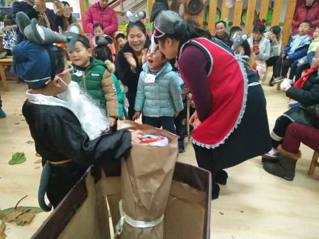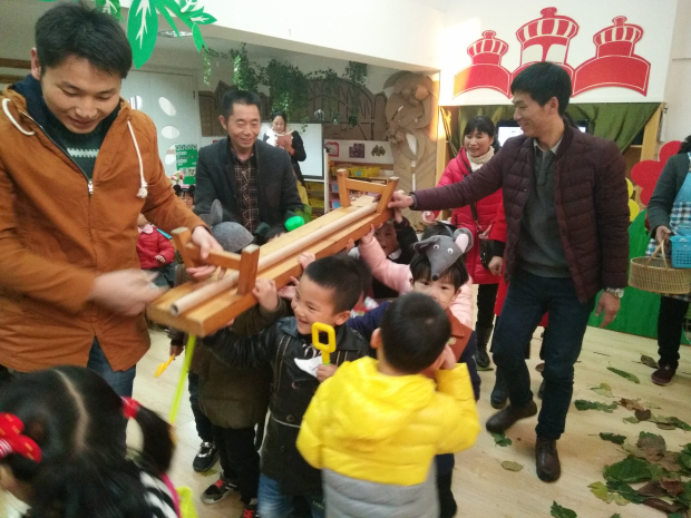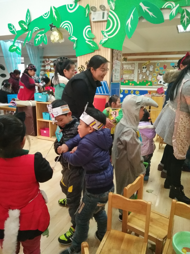 本次秋收节活动,改变以往家长以旁观者、检查者的身份观摩活动,鼓励每个家长参与表演游戏。家长们自己分配角色,可以是故事中的角色,也可以是导演或者剧务人员。大家相互帮忙打扮,一起想办法创设情境,结合生活经验制作道具,忙的不亦乐乎。通过参与游戏,家长们深刻感悟到表演游戏当中的每一个角色都很重要,大家都在为表演出谋划策,贡献自己的智慧。一个成熟的表演游戏,需要经历大家都熟悉故事内容,知道自己的出场顺序和对话;需要结合具体情境借助肢体动作去大胆表达表现;布置场景需要有创意想象能力,借用最简单的道具达成较理想的效果;完整表演更是考量和挑战表演者各方面的能力。表演游戏对孩子语言表达、社会交往、艺术欣赏等方面具有很大的促进,可以促进孩子多元感知和整体发展。家长只负责组织一组的表演,都累的满头大汗,他们有感而发,老师平时要组织30多个孩子一起游戏,真的不容易,佩服教师的专业能力,更加尊敬老师的工作。能得到家长们的认同和支持,作为老师,我们的辛苦都是值得的,也觉得自己的责任更加重大。在家长群里,家长们纷纷表达,认同游戏对孩子的发展的价值,以后要多参与这样的活动,一定支持幼儿园的工作。