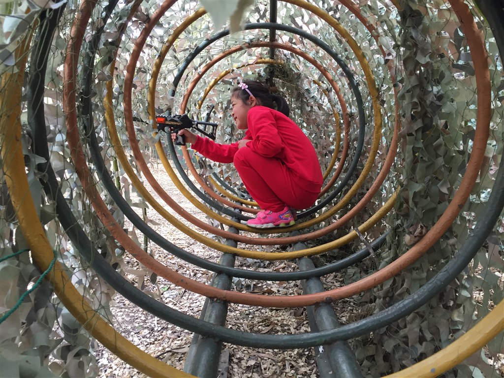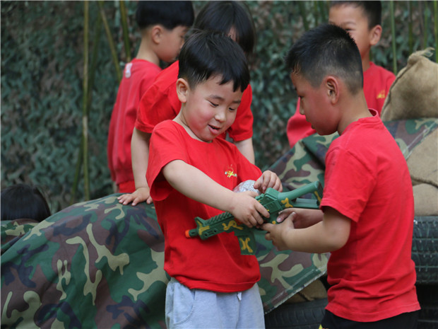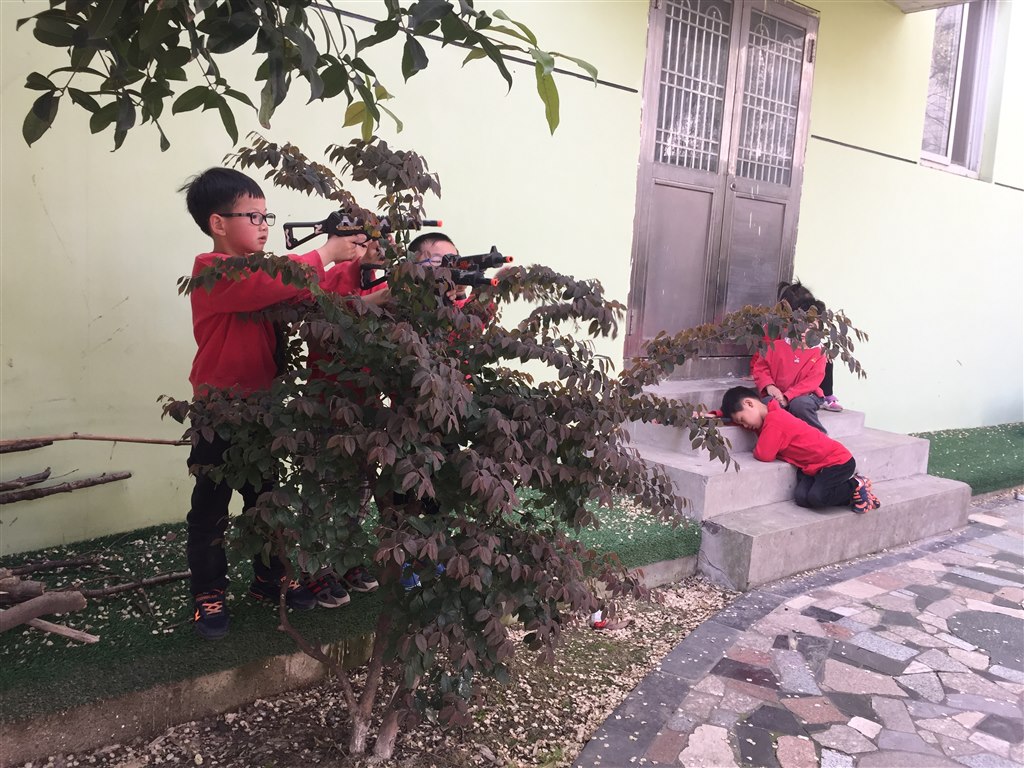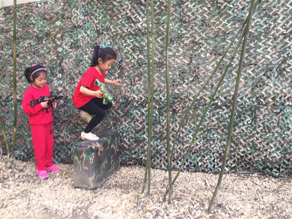 在野战营里孩子们自发开展了游戏活动,孩子们分为黑、绿两队,在孙国俊小朋友的带领下幼儿进行了野战前的准备活动:翻越土坡、快速躲闪练习等,热身后孩子们加入到了游戏活动中去,幼儿利用报纸球作为手榴弹,单手投掷“手榴弹”、借助竹子、沙包等器械躲避袭击、借助玩具步枪进行对抗活动,孩子们对野战游戏都很感兴趣,自发的制定了游戏规则,被“手榴弹”打中了就是受伤了,需要趴在沙袋上心里数10个数休息一下,孩子们觉得“中弹”很有意思,纷纷模仿起了受伤的动作,还召唤同队的战友过来支援,10个数的时间结束了之后孩子们又加入到了战斗中去,游戏活动中孩子们进行投掷、跳跃、翻越、躲闪等多种活动上肢力量和下肢力量都得到了充分的锻炼。野战营里激烈的对抗游戏吸引了中班、小班幼儿的注意,他们自发的加入到哥哥、姐姐们的游戏中去,去帮助哥哥、姐姐们搜集“手榴弹”,给野战营里的士兵们加油鼓劲,野战营里一片欢乐。