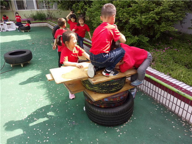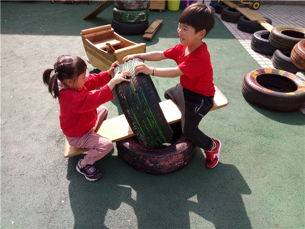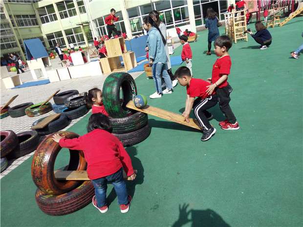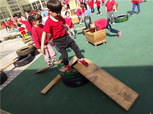 4月19日我园向全市开放户外活动观摩,我们中三班活动场地就在幼儿园大门口,玩得器械主要以轮胎、木板、塑框、小车为主,活动一开始小朋友们就不慌不忙自己搬玩具,自己布置游戏场地。虽然门口围着许多观摩活动的客人老师,但丝毫没有影响到孩子们活动的热情。看,小朋友们一会把轮胎叠起来做成一个碉堡;一会将轮胎和木板搭成一座小桥或滑滑梯;一会同伴合作将轮胎搭成山洞和荡桥……小朋友们自主、自由的游戏吸引着观摩的老师们,他们不停地拿手机和相机拍下小朋友们的精彩瞬间。