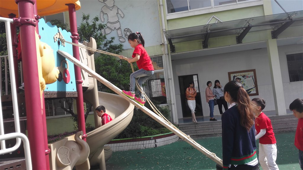 在大型滑滑梯的一面,创设了一道天梯通向大型滑滑梯,孩子们的挑战吸引来了大批的观摩老师,孩子们从天梯的底部徒手进行攀登直至滑滑梯的高处翻越进滑滑梯,开始只有大班的几名幼儿在尝试攀登,逐渐一波一波孩子都来挑战自我,甚至中班的孩子也来大胆挑战,孩子们的激情让围观的老师们不停地赞叹,他们拿手机和相机拍下小朋友们的精彩瞬间。