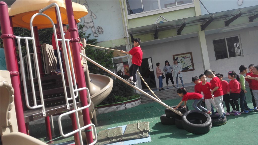 4月19日我园向全市开放户外活动观摩,我们的活动场地在幼儿园大门口,整个场地都是孩子们的游戏天地,场地上有大型木质器材、滑滑梯、轮胎、木板、小车各类垫子等,活动一开始小朋友们就自主的进行搬运器械,自己布置游戏场地。瞧,大班的哥哥姐姐还会帮助小班弟弟妹妹搬运器械。看,有的小朋友们把轮胎叠起来做成一个碉堡;有的将轮胎和木板搭成一座小桥或滑滑梯;有的会合作将轮胎搭成山洞和荡桥……