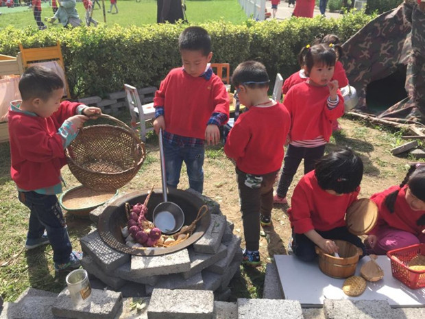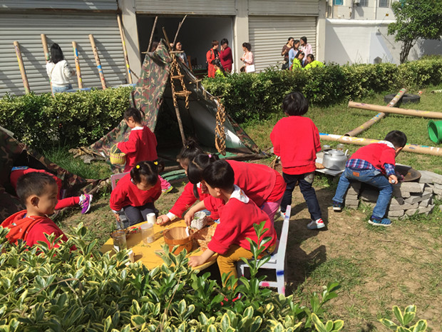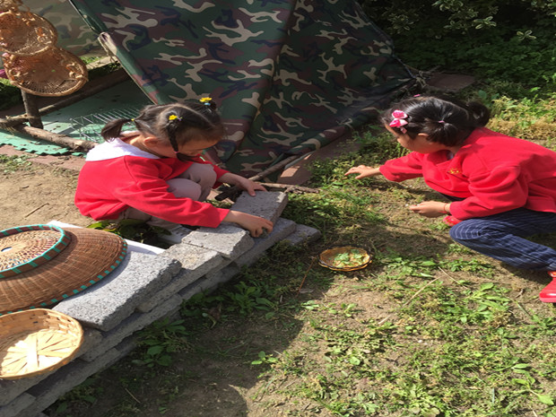 老师和孩子们自己利用废旧材料共同制作了丰富多样的娃娃家游戏材料,帐篷、小灶头、简易的餐桌、废弃的屏风做成了一道道家的门等等,孩子们就是在这样生态、自然的小角落里玩出了游戏大大的乐趣,一起走进我们的孩子吧……快乐的一天就这样在趣味的运动中开始了,孩子们时而钻进小小的帐篷里喝茶、休息;时而在方寸间的小灶头里挥舞着菜勺炒着美味的菜肴,把树枝树叶当美食,炒制一盘美味;把锅碗当架子鼓,敲出一首乐曲;中大班的孩子们拿起花篮去採树叶当食物喽,去到蔬菜地里拔蔬菜啦,给房子装上轮子,带它出门旅行玩得不亦乐乎。鸟语花香的园内乐曲灵动,小中大混龄的孩子们或三五一组,或团队合作,躲在树丛中,帐篷里,玩着属于他们的自然生态的娃娃家游戏……