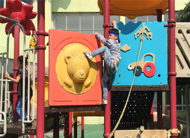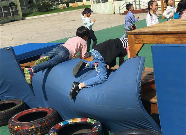 本次生态运动游戏是我班对全园的一次开放活动,其源于幼儿晨间游戏活动。小朋友在大操场用木质器材搭建爬梯,他们把两架梯子架起来分开,把横梯架在两架梯子中间,形成了一条爬行“索道”,小朋友可以翻山越岭爬过横梯。但是几次游戏后,有些小朋友们不满足于爬梯子了,只见孙国俊双手一撑,一只脚一抬,直接爬上了横梯,其他小朋友见到后纷纷效仿。于是,我们思考是否可以把这个幼儿新掌握的技能进行强化提炼,本次“守城记”运动游戏应运而生。