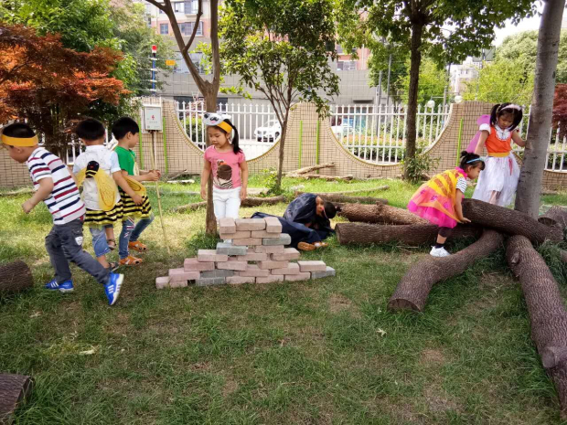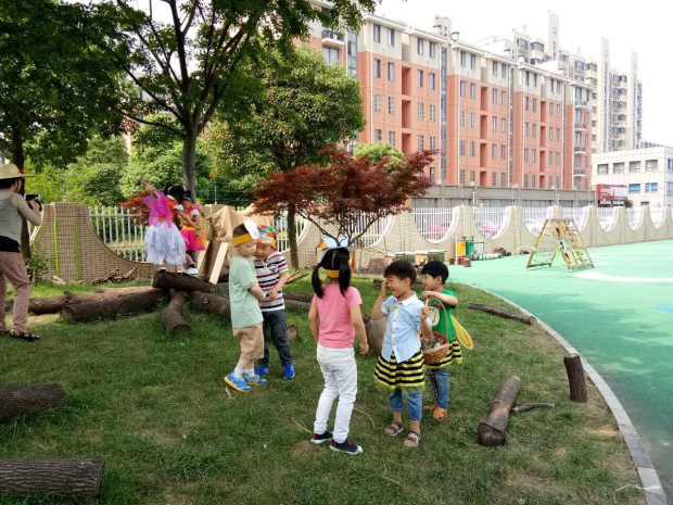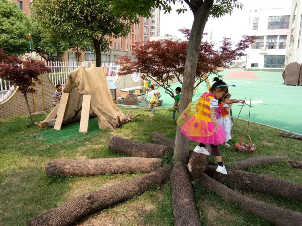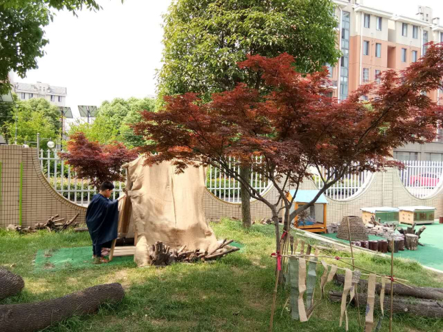 户外表演游戏,利用现有的生态环境资源是非常不错的。孩子们游戏的兴趣也随着场地的变换而不断浓厚,往年的表演游戏都在教室进行,空间小,孩子们的表演往往受局限,跑几步就到目的地了,表演的不尽兴!现在场地变成了户外,孩子们活动范围广了,更有现成的木屋,小树林做家,更贴近故事原有的情节,孩子们的表演也更形象。在室内表演时,场景布置道具都要老师和幼儿一起制作,而户外表演时,我们可以充分利用现有的环境资源,不用再费心费力做道具了!