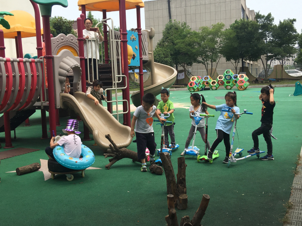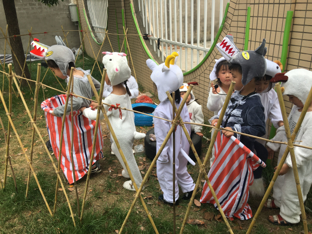 中班级部的表演游戏场地都集中在生态运动场地上。中一班的《春天的电话》场景设在轮胎山上,因为轮胎山周围可以是小动物的家;中二班把《汪汪队立大功》设在大型游乐场,因为那里的滑梯最像汪汪队总部的房子了;中三班的《小猪盖房子》设在草坪里,让草坪和树做树林场景;小一班的《小熊请客》则到了山坡上,让小熊的家更具迷人色彩;中四班的《小羊和狼》设在小沟渠旁,让小沟渠成了现成的小河。